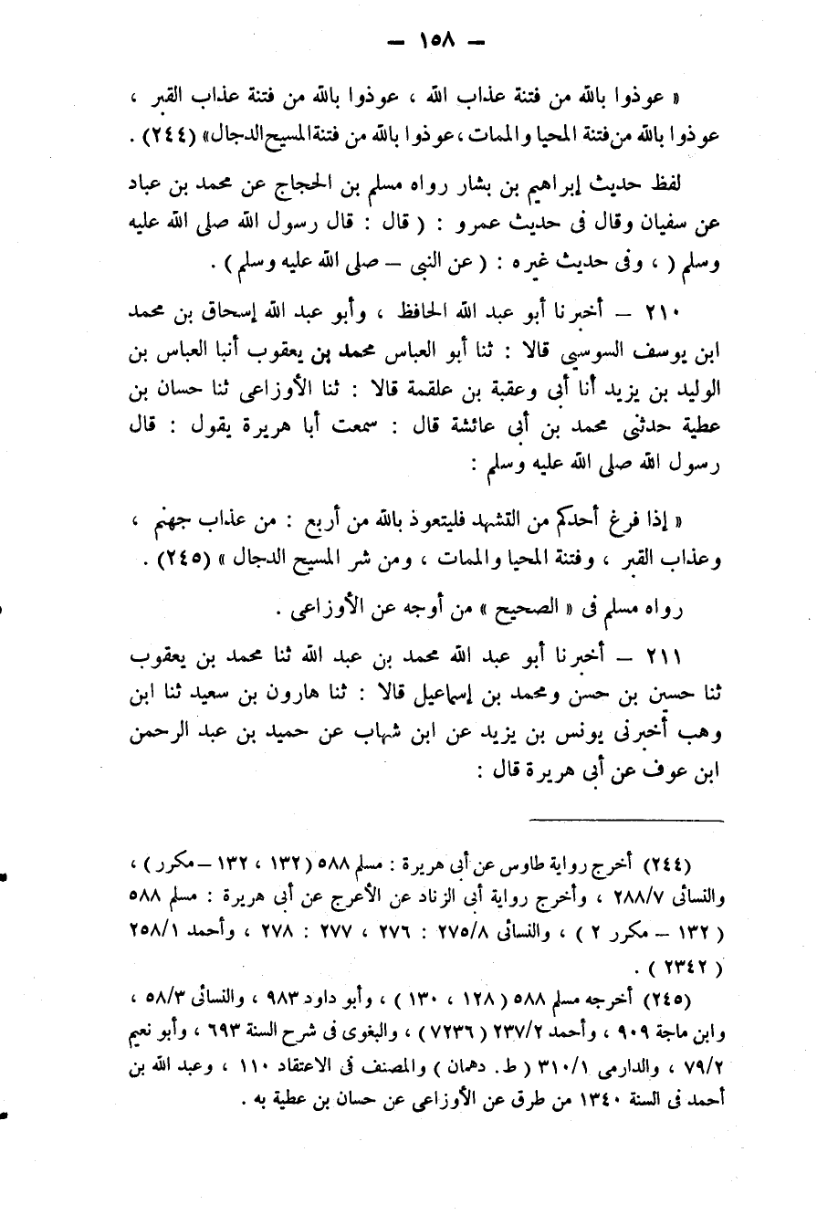 210 - (190) أَخْبَرَنَا أَبُو عَبْدِ اللَّهِ الْحَافِظُ، وَأَبُو عَبْدِ اللَّهِ إِسْحَاقُ بْنُ مُحَمَّدِ بْنِ يُوسُفَ السُّوسِيُّ قَالَا: ثَنَا أَبُو الْعَبَّاسِ مُحَمَّدُ بْنُ يَعْقُوبَ، أنبا الْعَبَّاسُ بْنُ الْوَلِيدِ بْنِ يَزِيدَ، أَنَا أَبِي وَعُقْبَةُ بْنُ عَلْقَمَةَ قَالَا: ثَنَا الْأَوْزَاعِيُّ، ثَنَا حَسَّانُ بْنُ عَطِيَّةَ، حَدَّثَنِي مُحَمَّدُ بْنُ أَبِي عائشه قَالَ: سَمِعْتُ أَبَا هُرَيْرَةَ يَقُولُ: قَالَ رَسُولُ اللَّهِ صَلَّى اللهُ عَلَيْهِ وَسَلَّمَ: «إِذَا فَرَغَ أَحَدُكُمْ مِنَ التَّشَهُّدِ فَلْيَتَعَوَّذْ بِاللَّهِ مِنْ أَرْبَعٍ، مِنْ عَذَابِ جَهَنَّمَ وَعَذَابِ الْقَبْرِ وَفِتْنَةِ الْمَحْيَا وَالْمَمَاتِ وَمِنْ شَرِّ الْمَسِيحِ الدَّجَّالِ»