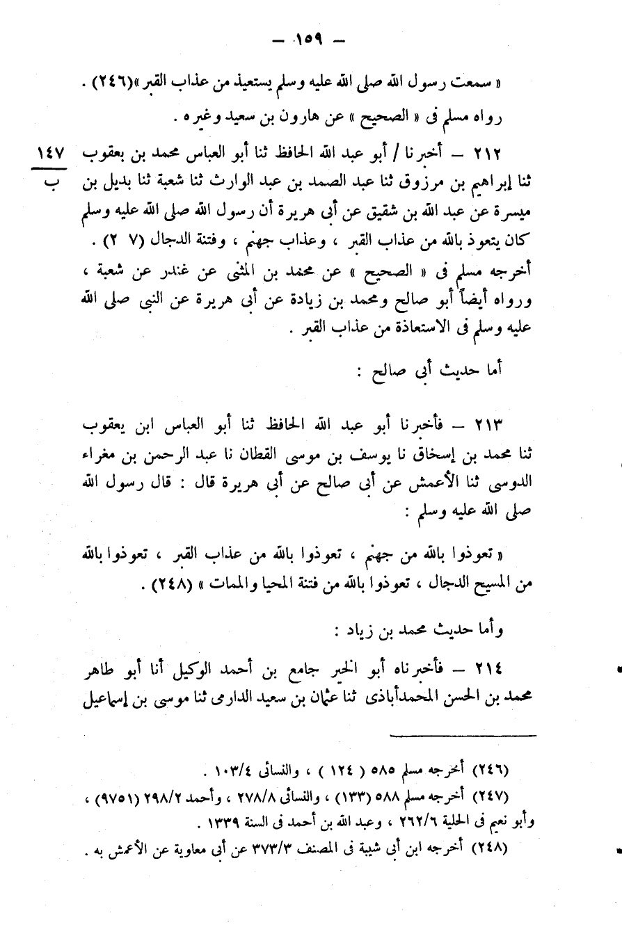 214 - (194) وَأَمَّا حَدِيثُ مُحَمَّدِ بْنِ زِيَادٍ فَأَخْبَرَنَاهُ أَبُو الْخَيْرِ جَامِعُ بْنُ أَحْمَدَ الْوَكِيلُ، أَنَا أَبُو طَاهِرٍ مُحَمَّدُ بْنُ الْحَسَنِ الْمُحَمَّدَ أَبَاذِيُّ، ثَنَا عُثْمَانُ بْنُ سَعِيدٍ الدَّارِمِيُّ، ثَنَا مُوسَى بْنُ إِسْمَاعِيلَ، #160# ثَنَا حَمَّادٌ وَهُوَ ابْنُ سَلَمَةَ، ثَنَا مُحَمَّدُ بْنُ زِيَادٍ، عَنْ أَبِي هُرَيْرَةَ عَنِ النَّبِيِّ صَلَّى اللهُ عَلَيْهِ وَسَلَّمَ أَنَّهُ «كَانَ يَتَعَوَّذُ بِاللَّهِ مِنْ شَرِّ الْمَحْيَا وَالْمَمَاتِ وَعَذَابِ الْقَبْرِ وَمِنْ شَرِّ الْمَسِيحِ الدَّجَّالِ»