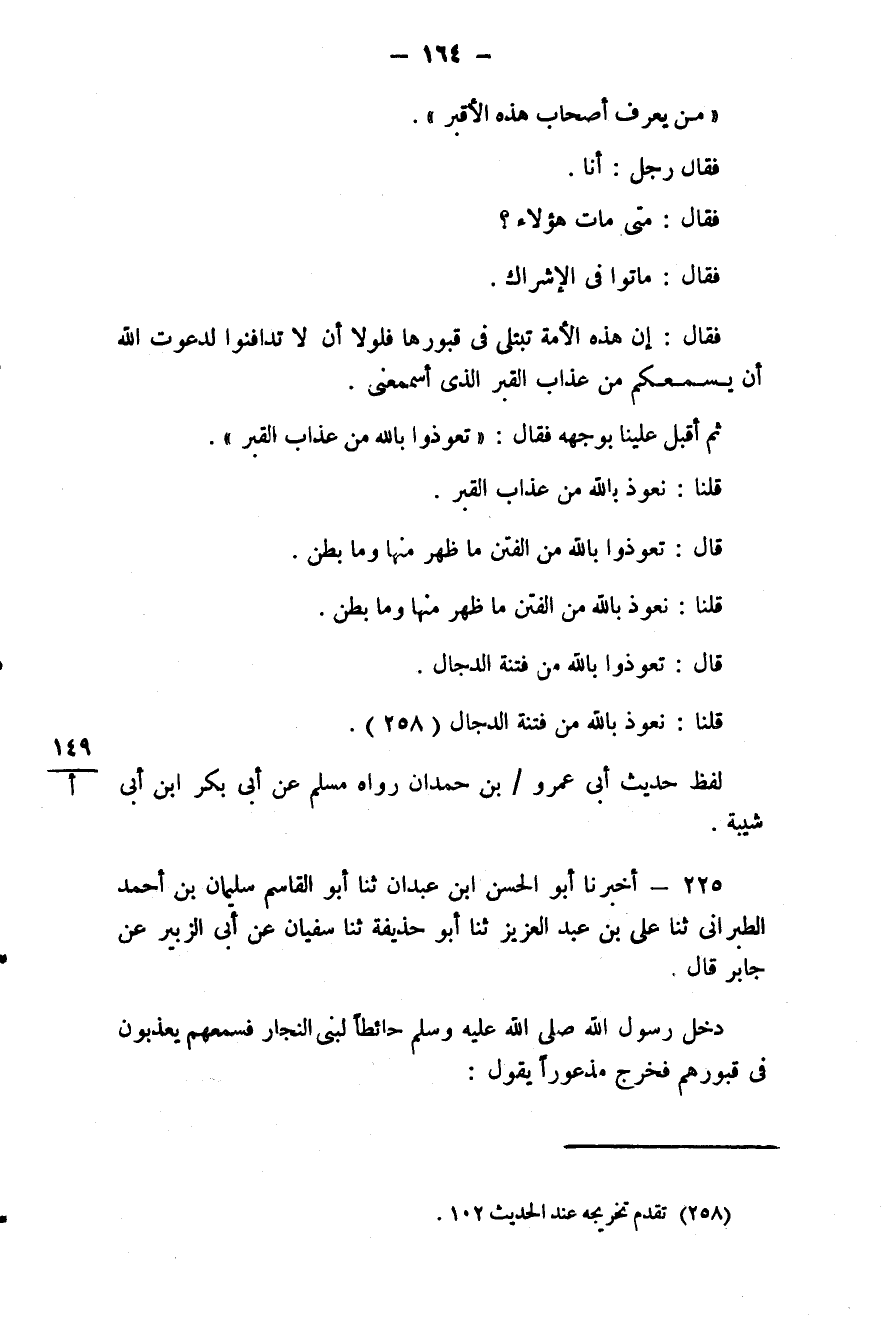 225 - (204) أَخْبَرَنَا أَبُو الْحَسَنِ بْنُ عَبْدَانَ، ثَنَا أَبُو الْقَاسِمِ سُلَيْمَانُ بْنُ أَحْمَدَ الطَّبَرَانِيُّ، ثَنَا عَلِيُّ بْنُ عَبْدِ الْعَزِيزِ، ثَنَا أَبُو حُذَيْفَةَ، ثَنَا سُفْيَانُ، عَنْ أَبِي الزُّبَيْرِ، عَنْ جَابِرٍ قَالَ: دَخَلَ رَسُولُ اللَّهِ صَلَّى اللهُ عَلَيْهِ وَسَلَّمَ حَائِطًا لِبَنِي النَّجَّارِ فَسَمِعَهُمْ يُعَذَّبُونَ فِي قُبُورِهِمْ، فَخَرَجَ مَذْعُورًا يَقُولُ: #165# «أَعُوذُ بِاللَّهِ مِنْ عَذَابِ الْقَبْرِ»