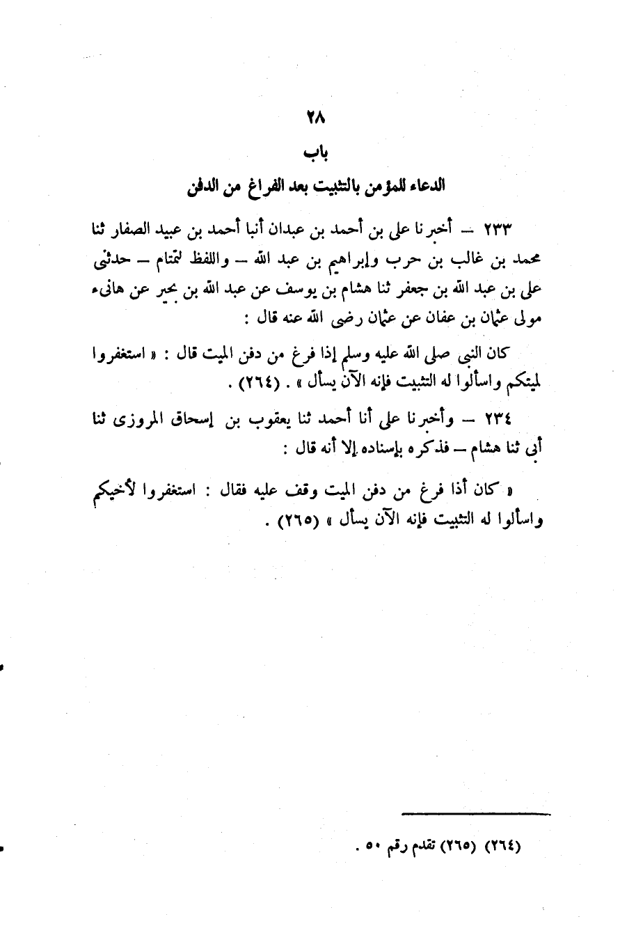 [28] بَابُ الدُّعَاءِ لِلْمُؤْمِنِ بِالتَّثْبِيتِ بَعْدَ الْفَرَاغِ مِنَ الدَّفْنِ