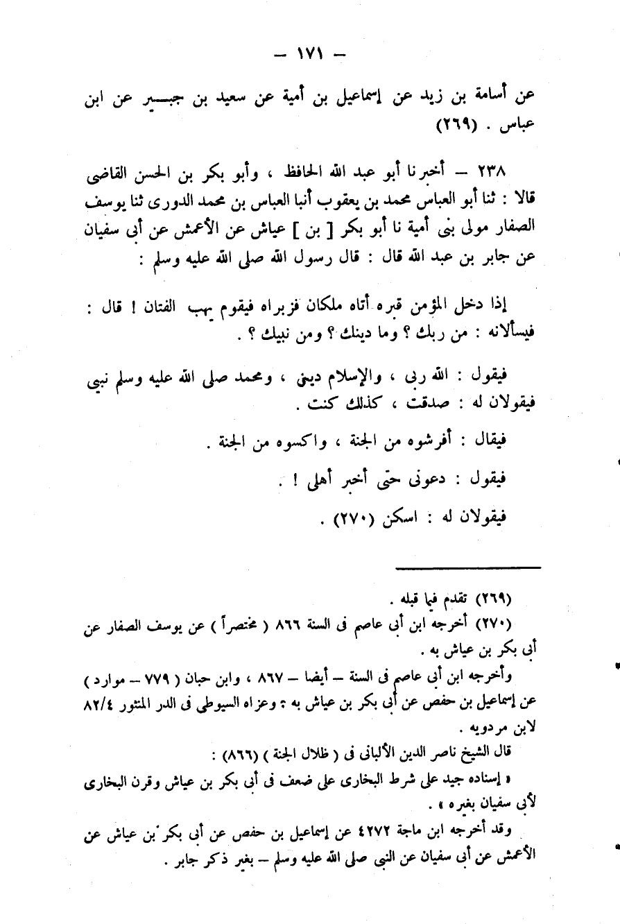 238 - (215) أَخْبَرَنَا أَبُو عَبْدِ اللَّهِ الْحَافِظُ، وَأَبُو بَكْرِ بْنُ الْحَسَنِ الْقَاضِي قَالَا: ثَنَا أَبُو الْعَبَّاسِ مُحَمَّدُ بْنُ يَعْقُوبَ، أَنَبَا الْعَبَّاسُ بْنُ مُحَمَّدٍ الدُّورِيُّ، ثَنَا يُوسُفُ الصَّفَّارُ مَوْلَى بَنِي أُمَيَّةَ، نَا أَبُو بَكْرِ بْنُ عَيَّاشٍ، عَنِ الْأَعْمَشِ، عَنْ أَبِي سُفْيَانَ، عَنْ جَابِرِ بْنِ عَبْدِ اللَّهِ قَالَ: قَالَ رَسُولُ اللَّهِ صَلَّى اللهُ عَلَيْهِ وَسَلَّمَ: " إِذَا دَخَلَ الْمُؤْمِنُ قَبْرَهُ أَتَاهُ مَلَكَانِ فَزَبَرَاهُ فَيَقُومُ يَهَبُ الْفَتَّانَ. قَالَ: فَيَسْأَلَانِهِ مَنْ رَبُّكَ وَمَا دِينُكَ وَمَنْ نَبِيُّكَ؟ فَيَقُولُ: اللَّهُ رَبِّي وَالْإِسْلَامُ دِينِي وَمُحَمَّدٌ صَلَّى اللَّهُ عَلَيْهِ وَسَلَّم نَبِيِّي، فَيَقُولَانِ لَهُ: صَدَقْتَ، كَذَلِكَ كُنْتَ، فَيُقَالُ: افْرُشُوهُ مِنَ الْجَنَّةِ، وَاكْسُوهُ مِنَ الْجَنَّةِ. فَيَقُولُ: دَعُونِي حَتَّى أُخْبِرَ أَهْلِي، فَيَقُولَانِ لَهُ: اسْكُنْ "