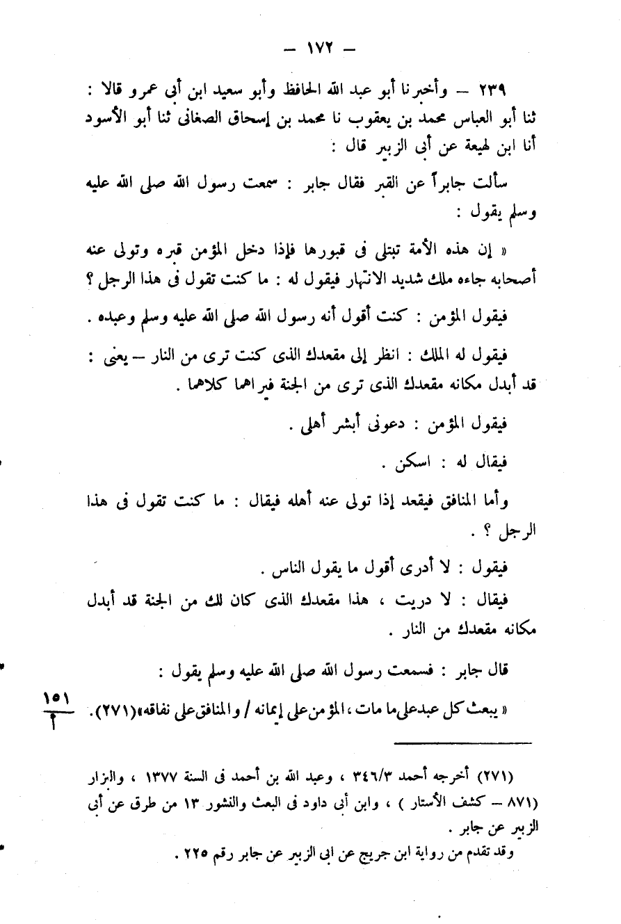 239 - (216) وَأَخْبَرَنَا أَبُو عَبْدِ اللَّهِ الْحَافِظُ، وَأَبُو سَعِيدِ بْنُ أَبِي عَمْرٍو قَالَا: ثَنَا أَبُو الْعَبَّاسِ مُحَمَّدُ بْنُ يَعْقُوبَ، نَا مُحَمَّدُ بْنُ إِسْحَاقَ الصَّغَانِيُّ، ثَنَا أَبُو الْأَسْوَدِ، أَنَا ابْنُ لَهِيعَةَ، عَنْ أَبِي الزُّبَيْرِ قَالَ: سَأَلْتُ جَابِرًا عَنِ الْقَبْرِ، فَقَالَ جَابِرٌ: سَمِعْتُ رَسُولَ اللَّهِ صَلَّى اللهُ عَلَيْهِ وَسَلَّمَ يَقُولُ: " إِنَّ هَذِهِ الْأُمَّةَ تُبْتَلَى فِي قُبُورِهَا، فَإِذَا دَخَلَ الْمُؤْمِنُ قَبْرَهُ وَتَوَلَّى عَنْهُ أَصْحَابُهُ جَاءَهُ مَلَكٌ شَدِيدُ الِانْتِهَارِ، فَيَقُولُ لَهُ: مَا كُنْتَ تَقُولُ فِي هَذَا الرَّجُلِ؟ فَيَقُولُ الْمُؤْمِنُ: كُنْتُ أَقُولُ: إِنَّهُ رَسُولُ اللَّهِ صَلَّى اللَّهُ عَلَيْهِ وَسَلَّم وَعَبْدُهُ، فَيَقُولُ لَهُ الْمَلَكُ: انْظُرْ إِلَى مَقْعَدِكَ الَّذِي كُنْتَ تَرَى مِنَ النَّارِ، يَعْنِي قَدْ أُبْدِلَ مَكَانَهُ مَقْعَدُكَ الَّذِي تَرَى مِنَ الْجَنَّةِ، فَيَرَاهُمَا كِلَاهُمَا، فَيَقُولُ الْمُؤْمِنُ: دَعُونِي أُبَشِّرُ أَهْلِي، فَيُقَالُ لَهُ: اسْكُنْ، وَأَمَّا الْمُنَافِقُ فَيَقْعُدُ إِذَا تَوَلَّى عَنْهُ أَهْلُهُ فَيُقَالُ: مَا كُنْتَ تَقُولُ فِي هَذَا الرَّجُلِ؟ فَيَقُولُ: لَا أَدْرِي، أَقُولُ مَا يَقُولُ النَّاسُ، فَيُقَالُ لَهُ: لَا دَرَيْتَ، هَذَا مَقْعَدُكَ الَّذِي كَانَ لَكَ مِنَ الْجَنَّةِ قَدْ أُبْدِلَ مَكَانَهُ مَقْعَدُكَ مِنَ النَّارِ "