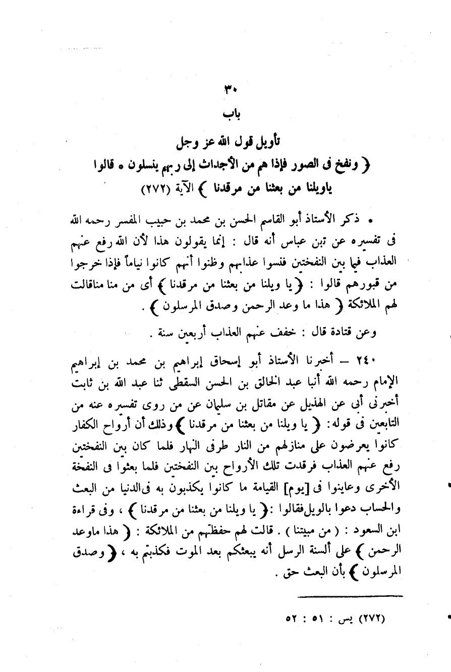 [30] بَابُ تَاوِيلِ قَوْلِ اللَّهِ عَزَّ وَجَلَّ {وَنُفِخَ فِي الصُّورِ فَإِذَا هُمْ مِنَ الْأَجْدَاثِ إِلَى رَبِّهِمْ يَنْسِلُونَ قَالُوا يَا وَيْلَنَا مَنْ بَعَثَنَا مِنْ مَرْقَدِنَا} الْآيَةُ