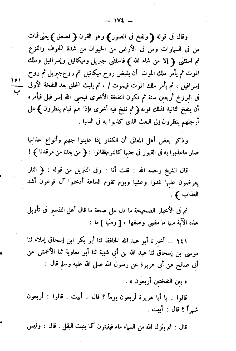 241 - (218) وَمِنْهَا مَا أَخْبَرَنَا أَبُو عَبْدِ اللَّهِ الْحَافِظُ، ثَنَا أَبُو بَكْرِ بْنُ إِسْحَاقَ إِمْلَاءً، ثَنَا مُوسَى بْنُ إِسْحَاقَ، ثَنَا عَبْدُ اللَّهِ بْنُ أَبِي شَيْبَةَ، ثَنَا أَبُو مُعَاوِيَةَ، نَا الْأَعْمَشُ، عَنْ أَبِي صَالِحٍ، عَنْ أَبِي هُرَيْرَةَ عَنْ رَسُولِ اللَّهِ صَلَّى اللَّهُ عَلَيْهِ وَسَلَّمَ قَالَ: «بَيْنَ النَّفْخَتَيْنِ أَرْبَعُونَ» قَالُوا: يَا أَبَا هُرَيْرَةَ أَرْبَعُونَ يَوْمًا قَالَ أَبَيْتُ قَالُوا: أَرْبَعُونَ شَهْرًا قَالَ: أَبَيْتُ قَالَ: " ثُمَّ يُنْزِلُ اللَّهُ مِنَ السَّمَاءِ مَاءً فَيَنْبُتُونَ كَمَا يَنْبُتُ الْبَقْلُ قَالَ: «وَلَيْسَ #175# مِنَ الْإِنْسَانِ شَيْءٌ إِلَّا يَبْلَى إِلَّا عَظْمًا وَاحِدًا وَهُوَ عَجْبُ الذَّنَبِ وَفِيهِ يَرْكَبُ الْخَلْقُ يَوْمَ الْقِيَامَةِ»