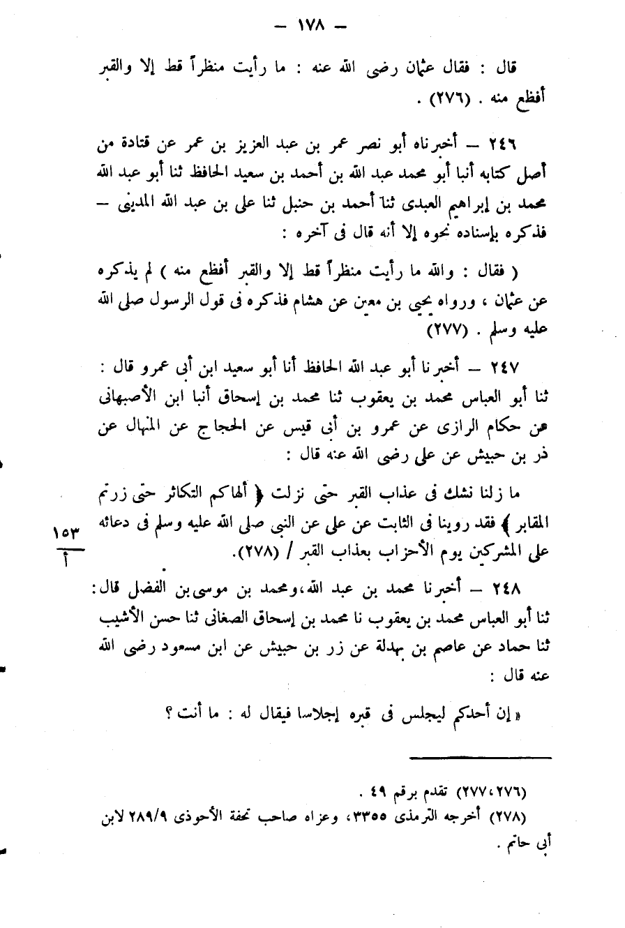 247 - (224) أَخْبَرَنَا أَبُو عَبْدِ اللَّهِ الْحَافِظُ، أَنَا أَبُو سَعِيدِ بْنُ أَبِي عَمْرٍو قَالَ: ثَنَا أَبُو الْعَبَّاسِ مُحَمَّدُ بْنُ يَعْقُوبَ، ثَنَا مُحَمَّدُ بْنُ إِسْحَاقَ، أنَبَا ابْنُ الْأَصْبَهَانِيِّ، عَنْ حَكَّامٍ الرَّازِيِّ، عَنْ عَمْرِو بْنِ أَبِي قَيْسٍ، عَنِ الْحَجَّاجِ عَنِ الْمِنْهَالِ، عَنْ ذِرِّ بْنِ حُبَيْشٍ، عَنْ عَلِيٍّ رَضِيَ اللَّهُ عَنْهُ قَالَ: «مَا زِلْنَا نَشُكُّ فِي عَذَابِ الْقَبْرِ حَتَّى نَزَلَتْ {أَلْهَاكُمُ التَّكَاثُرُ حَتَّى زُرْتُمُ الْمَقَابِرَ»} فَقَدْ رُوِّينَا فِي الثَّابِتِ عَنْ عَلِيٍّ عَنِ النَّبِيِّ صَلَّى اللهُ عَلَيْهِ وَسَلَّمَ فِي دُعَائِهِ عَلَى الْمُشْرِكِينَ يَوْمَ الْأَحْزَابِ بِعَذَابِ الْقَبْرِ