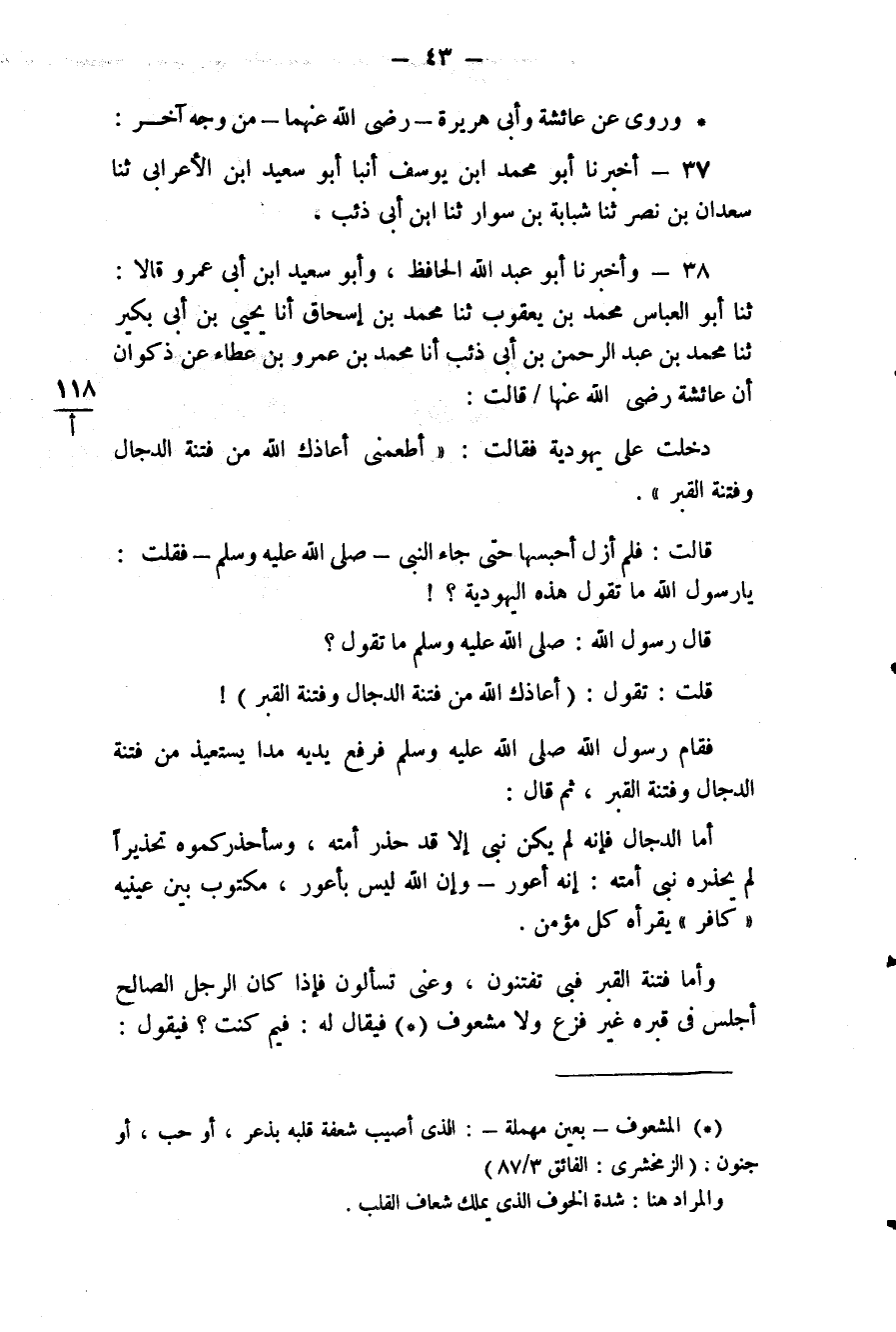 38 - وَأَخْبَرَنَا أَبُو عَبْدِ اللَّهِ الْحَافِظُ، وَأَبُو سَعِيدِ بْنُ أَبِي عَمْرٍو قَالَا: ثَنَا أَبُو الْعَبَّاسِ مُحَمَّدُ بْنُ يَعْقُوبَ، ثَنَا مُحَمَّدُ بْنُ إِسْحَاقَ، أَنَا يَحْيَى بْنُ أَبِي بُكَيْرٍ، ثَنَا مُحَمَّدُ بْنُ عَبْدِ الرَّحْمَنِ بْنِ أَبِي ذِئْبٍ، أَنَا مُحَمَّدُ بْنُ عَمْرِو بْنِ عَطَاءٍ، عَنْ ذَكْوَانَ، أَنَّ عَائِشَةَ رَضِيَ اللَّهُ عَنْهَا قَالَتْ: دَخَلَتْ عَلَيَّ يَهُودِيَّةٌ، فَقَالَتْ: أَطْعِمِينِي، أَعَاذَكِ اللَّهُ مِنْ فِتْنَةِ الدَّجَّالِ وَفِتْنَةِ الْقَبْرِ قَالُتْ: فَلَمْ أَزَلْ أَحْبِسُهَا حَتَّى جَاءَ النَّبِيُّ صلى الله عليه وسلم، فَقُلْتُ: يَا رَسُولَ اللَّهِ، مَا تَقُولُ هَذِهِ الْيَهُودِيَّةُ؟ قَالَ رَسُولُ اللَّهِ صَلَّى اللهُ عَلَيْهِ وَسَلَّمَ: " مَا تَقُولُ قُلْتُ، تَقُولُ: أَعَاذَكِ اللَّهُ مِنْ فِتْنَةِ الدَّجَّالِ وَفِتْنَةِ الْقَبْرِ " فَقَامَ رَسُولُ اللَّهِ صلى الله عليه وسلم، فَرَفَعَ يَدَيْهِ مَدًّا يَسْتَعِيذُ مِنْ فِتْنَةِ الدَّجَّالِ وَفِتْنَةِ الْقَبْرِ، ثُمَّ قَالَ: " أَمَّا الدَّجَّالُ فَإِنَّهُ لَمْ يَكُنْ نَبِيُّ إِلَّا قَدْ حَذَّرَ أُمَّتَهُ وَسَأُحَذِّرُكُمُوهُ تَحْذِيرًا لَمْ يُحَذِّرْهُ نَبِيُّ أُمَّتَهُ، إِنَّهُ أَعْوَرُ، وَإِنَّ اللَّهَ لَيْسَ بِأَعْوَرَ، مَكْتُوبٌ بَيْنَ عَيْنَيْهٍ كَافِرٌ، يَقْرَأُهُ كُلُّ مُؤْمِنٍ وَأَمَّا فِتْنَةُ الْقَبْرِ فَبِي تُفْتَنُونَ وَعَنِّي تُسْأَلُونَ، فَإِذَا كَانَ الرَّجُلُ الصَّالِحُ أُجْلِسَ فِي قَبْرِهِ غَيْرَ فَزِعٍ وَلَا مَشْعُوفٍ فَيُقَالُ لَهُ: فِيمَ كُنْتَ؟ فَيَقُولُ: #44# فِي الْإِسْلَامِ فَيُقَالُ: مَا هَذَا الرَّجُلُ؟ فَيَقُولُ مُحَمَّدٌ رَسُولُ اللَّهِ صلى الله عليه وسلم جَاءَنَا بِالْبَيِّنَاتِ مِنْ عِنْدِ اللَّهِ، فَآمَنَّا وَصَدَّقْنَا، فَيُقَالُ لَهُ: هَلْ رَأَيْتَ اللَّهَ؟ فَيَقُولُ: مَا يَنْبَغِي لِأَحَدٍ أَنْ يَرَى اللَّهَ عَزَّ وَجَلَّ، فَيُفْرَجُ لَهُ فُرْجَةٌ قِبَلَ النَّارِ فَيَنْظُرُ إِلَيْهَا يَحْطِمُ بَعْضُهَا بَعْضًا، فَيُقَالُ لَهُ: انْظُرْ إِلَى مَا وَقَاكَ اللَّهُ عَزَّ وَجَلَّ، ثُمَّ يُفْرَجُ لَهُ فُرْجَةٌ قِبَلَ الْجَنَّةِ فَيَنْظُرُ إِلَى مَا فِيهَا مِنْ زَهْرَتِهَا، وَمَا فِيهَا فَيُقَالُ لَهُ: هَا هُنَا مَقْعَدُكَ، وَيُقَالُ: عَلَى الْيَقِينِ كُنْتَ وَعَلَيْهِ مُتَّ، وَعَلَيْهِ تُبْعَثُ إِنْ شَاءَ اللَّهُ، وَإِذَا كَانَ الرَّجُلُ السُّوءُ أُجْلِسَ فِي قَبْرِهِ فَزِعًا مَشْعُوفًا، فَيُقَالُ لَهُ: فِيمَ كُنْتَ؟ فَيَقُولُ: لَا أَدْرِي، فَيُقَالُ: مَا هَذَا الرَّجُلُ؟ فَيَقُولُ: سَمِعْنَا النَّاسَ يَقُولُونَ، فَيُفْرَجُ فُرْجَةٌ قِبَلَ الْجَنَّةِ فَيَنْظُرُ إِلَى زَهْرَتِهَا وَمَا فِيهَا، فَيُقَالُ لَهُ: انْظُرْ مَا صَرْفَ اللَّهُ عَنْكَ وَيُفَرَّجُ لَهُ فُرْجَةٌ قِبَلَ النَّارِ، فَيَنْظُرُ إِلَيْهَا يَحْطِمُ بَعْضُهَا بَعْضًا، فَيُقَالُ: هَذَا مَقْعَدُكَ، ثُمَّ يُقَالُ: عَلَى الشَّكِّ كُنْتَ وَعَلَيْهِ مِتَّ وَعَلَيْهِ تُبْعَثُ إِنْ شَاءَ اللَّهُ "