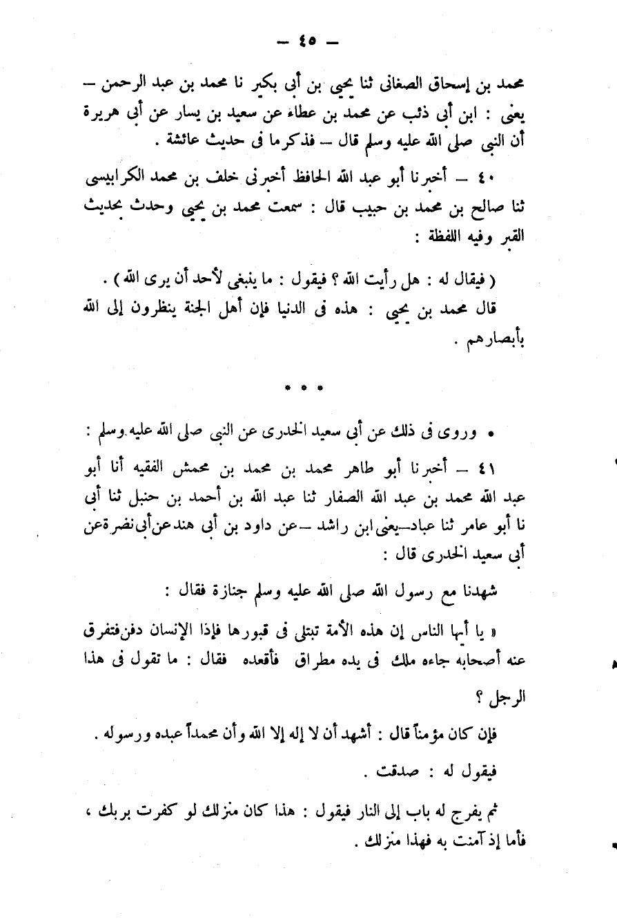 40 - (31) أَخْبَرَنَا أَبُو عَبْدِ اللَّهِ الْحَافِظُ، أَخْبَرَنِي خَلَفُ بْنُ مُحَمَّدٍ الْكَرَابِيسِيُّ، ثَنَا صَالِحُ بْنُ مُحَمَّدِ بْنِ حَبِيبٍ قَالَ: سَمِعْتُ مُحَمَّدَ بْنَ يَحْيَى، وَحَدَّثَ بِحَدِيثِ الْقَبْرِ، وَفِيهِ اللَّفْظَةُ: " فَيُقَالُ لَهُ: هَلْ رَأَيْتَ اللَّهَ، فَيَقُولُ: «مَا يَنْبَغِي لِأَحَدٍ أَنْ يَرَى اللَّهَ» قَالَ مُحَمَّدُ بْنُ يَحْيَى: هَذِهِ فِي الدُّنْيَا، فَإِنَّ أَهْلَ الْجَنَّةِ يَنْظُرُونَ إِلَى اللَّهِ بِأَبْصَارِهِمْ "