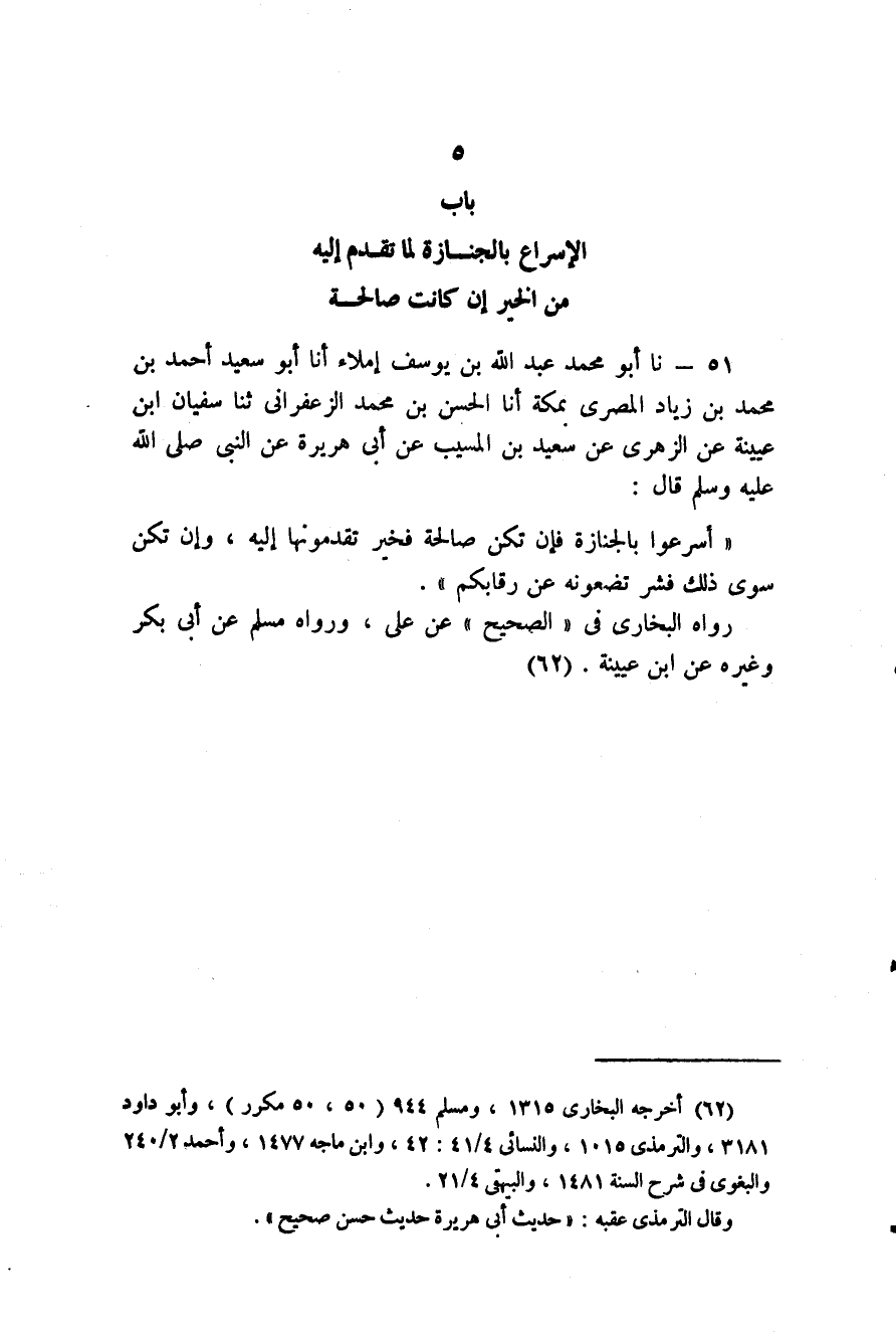 51 - (41) نَا أَبُو مُحَمَّدٍ عَبْدُ اللَّهِ بْنُ يُوسُفَ إِمْلَاءً، أَنَا أَبُو سَعِيدٍ أَحْمَدُ بْنُ مُحَمَّدِ بْنِ زِيَادٍ الْمصْرِيُّ بِمَكَّةَ، أَنَا الْحَسَنُ بْنُ مُحَمَّدٍ الزَّعْفَرَانِيُّ، ثَنَا سُفْيَانُ بْنُ عُيَيْنَةَ، عَنِ الزُّهْرِيِّ، عَنْ سَعِيدِ بْنِ الْمُسَيِّبِ، عَنْ أَبِي هُرَيْرَةَ عَنِ النَّبِيِّ صَلَّى اللَّهُ عَلَيْهِ وَسَلَّم قَالَ: «أَسْرِعُوا بِالْجِنَازَةِ فَإِنْ تَكُنْ صَالِحَةً فَخَيْرٌ تُقَدِّمُونَهَا إِلَيْهِ، وَإِنْ تَكُنْ سِوَى ذَلِكَ فَشَرٌّ تَضَعُونَهُ عَنْ رِقَابِكُمْ» رَوَاهُ الْبُخَارِيُّ فِي الصَّحِيحِ عَنْ عَلِيٍّ، وَرَوَاهُ مُسْلِمٌ عَنْ أَبِي بَكْرٍ وَغَيْرِهِ عَنِ ابْنِ عُيَيْنَةَ