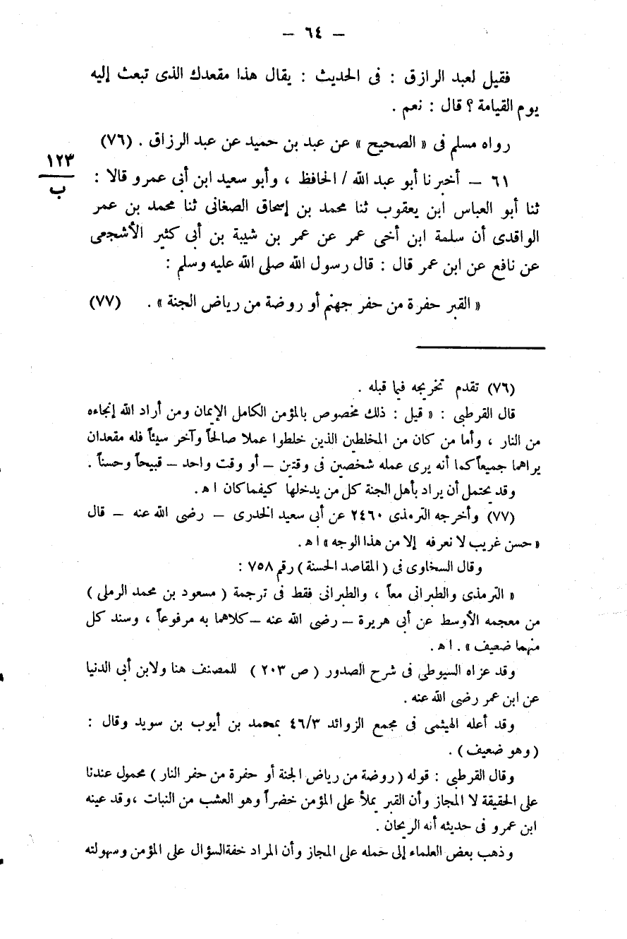 61 - (50) أَخْبَرَنَا أَبُو عَبْدِ اللَّهِ الْحَافِظُ، وَأَبُو سَعِيدِ بْنُ أَبِي عَمْرٍو قَالَا: ثَنَا أَبُو الْعَبَّاسِ بْنُ يَعْقُوبَ، ثَنَا مُحَمَّدُ بْنُ إِسْحَاقَ الصَّغَانِيُّ، ثَنَا مُحَمَّدُ بْنُ عُمَرَ الْوَاقِدِيُّ، أَنَ سَلَمَةُ بْنُ أَخِي عُمَرَ، عَنْ عُمَرَ بْنِ شَيْبَةَ بْنِ أَبِي كَثِيرٍ الْأَشْجَعِيِّ، عَنْ نَافِعٍ، عَنِ ابْنِ عُمَرَ قَالَ: قَالَ رَسُولُ اللَّهِ صَلَّى اللَّهُ عَلَيْهِ وَسَلَّم: «الْقَبْرُ حُفْرَةٌ مِنْ حُفَرِ جَهَنَّمَ أَوْ رَوْضَةٌ مِنْ رِيَاضِ الْجَنَّةِ»