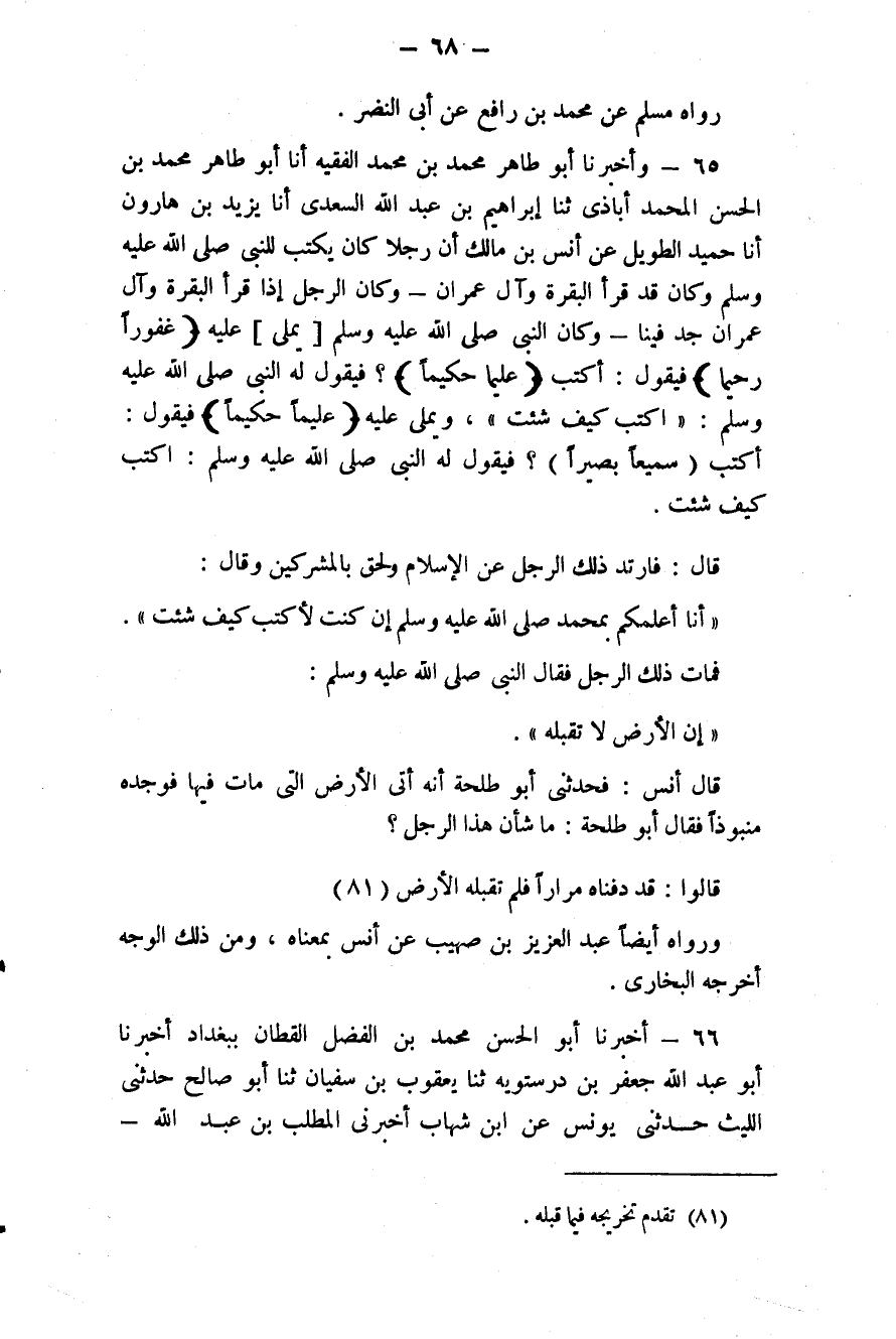 65 - (54) وَأَخْبَرَنَا أَبُو طَاهِرٍ مُحَمَّدُ بْنُ مُحَمَّدٍ الْفَقِيهُ، أَنَا أَبُو طَاهِرٍ مُحَمَّدُ بْنُ الْحَسَنِ الْمُحَمَّدَ أَبَاذِيُّ، ثَنَا إِبْرَاهِيمُ بْنُ عَبْدِ اللَّهِ السَّعْدِيُّ، أَنَا يَزِيدُ بْنُ هَارُونَ، أَنَا حُمَيْدٌ الطَّوِيلُ، عَنْ أَنَسِ بْنِ مَالِكٍ، أَنَّ رَجُلًا كَانَ يَكْتُبُ لِلنَّبِيِّ صَلَّى اللَّهُ عَلَيْهِ وَسَلَّم، وَكَانَ قَدْ قَرَأَ الْبَقَرَةَ وَآلَ عِمْرَانَ، وَكَانَ الرَّجُلُ إِذَا قَرَأَ الْبَقَرَةَ وَآلَ عِمْرَانَ جَد فِينَا وَكَانَ النَّبِيُّ صلى الله عليه وسلم يُمْلِي عَلَيْهِ {غَفُورًا رَحِيمًا} فَيَقُولُ: أَكْتُبُ: {عَلِيمًا حَكِيمًا}، فَيَقُولُ لَهُ النَّبِيُّ صَلَّى اللَّهُ عَلَيْهِ وَسَلَّم: «اكْتُبْ كَيْفَ شِئْتَ»، وَيُمْلِي عَلَيْهِ {عَلِيمًا حَكِيمًا} فَيَقُولُ: أَكْتُبُ {سَمِيعًا بَصِيرًا}، فَيَقُولُ لَهُ النَّبِيُّ صَلَّى اللَّهُ عَلَيْهِ وَسَلَّم: «اكْتُبْ كَيْفَ شِئْتَ» قَالَ: فَارْتَدَّ ذَلِكَ الرَّجُلُ عَنِ الْإِسْلَامِ وَلَحِقَ بِالْمُشْرِكِينَ وَقَالَ: أَنَا أَعْلَمُكُمْ بِمُحَمَّدٍ صَلَّى اللَّهُ عَلَيْهِ وَسَلَّم إِنِّ كُنْتُ لَأَكْتُبُ كَيْفَ شِئْتُ، فَمَاتَ ذَلِكَ الرَّجُلُ، فَقَالَ النَّبِيُّ صَلَّى اللَّهُ عَلَيْهِ وَسَلَّم: «إِنَّ الْأَرْضَ لَا تَقْبَلُهُ» قَالَ أَنَسٌ: فَحَدَّثَنِي أَبُو طَلْحَةَ أَنَّهُ أَتَى الْأَرْضَ الَّتِي مَاتَ فِيهَا فَوَجَدَهُ مَنْبُوذًا، فَقَالَ أَبُو طَلْحَةَ: مَا شَانُ هَذَا الرَّجُلِ؟ قَالُوا: قَدْ دَفَنَّاهُ مِرَارًا فَلَمْ تَقْبَلْهُ الْأَرْضُ.
