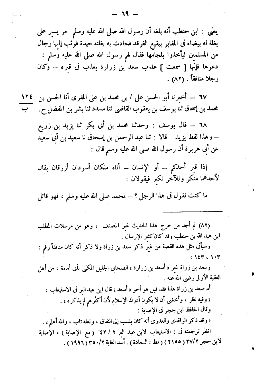 68 - قَالَ يُوسُفُ: وَحَدَّثَنَا مُحَمَّدُ بْنُ أَبِي بَكْرٍ، ثَنَا يَزِيدُ بْنُ زُرَيْعٍ، وَهَذَا لَفْظُ يَزِيدَ قَالَا: ثَنَا عَبْدُ الرَّحْمَنِ بْنُ إِسْحَاقَ، نَا سَعِيدُ بْنُ أَبِي سَعِيدٍ، عَنْ أَبِي هُرَيْرَةَ أَنَّ رَسُولَ اللَّهِ صَلَّى اللهُ عَلَيْهِ وَسَلَّمَ قَالَ: " إِذَا قُبِرَ أَحَدُكُمْ، أَوِ الْإِنْسَانُ، أَتَاهُ مَلَكَانِ أَسْوَدَانِ أَزْرَقَانِ يُقَالُ لِأَحَدِهِمَا مُنْكَرٌ وَلِلْآخَرِ نَكِيرٌ، فَيَقُولَانِ: مَا كُنْتَ تَقُولُ فِي هَذَا الرَّجُلِ، لِمُحَمَّدٍ صَلَّى اللهُ عَلَيْهِ وَسَلَّمَ؟، فَهُوَ قَائِلٌ #70# مَا كَانَ يَقُولُ، إِنْ كَانَ مُؤْمِنًا قَالَ: هُوَ عَبْدُ اللَّهِ وَرَسُولُهُ، وَيَشْهَدُ أَنْ لَا إِلَهَ إِلَّا اللَّهُ وَأَنَّ مُحَمَّدًا عَبْدُهُ وَرَسُولُهُ قَالَ: فَيَقُولَانِ: إِنْ كُنَّا لَنَعْلَمُ أَنَّكَ تَقُولُ ذَلِكَ، ثُمَّ يُفْسَحُ لَهُ قَبْرِهِ سَبْعُونَ ذِرَاعًا فِي سَبْعِينَ ذِرَاعًا، وَيُنَوَّرُ لَهُ فِيهِ، ثُمَّ يُقَالُ لَهُ: نَمْ، فَيَقُولُ دَعُونِي أَرْجِعْ إِلَى أَهْلِي أُخْبِرُهُمْ، فَيُقَالُ لَهُ: نَمْ كَنَوْمَةِ الْعَرُوسِ الَّذِي لَا يُوقِظُهُ إِلَّا أَحَبُّ أَهْلِهِ إِلَيْهِ، حَتَّى يَبْعَثُهُ اللَّهُ عَزَّ وَجَلَّ مِنْ مَضْجَعِهِ ذَلِكَ، وَإِنْ كَانَ مُنَافِقًا قَالَ: لَا أَدْرِي، كُنْتُ أَسْمَعُ النَّاسَ يَقُولُونَ ذَلِكَ فَكُنْتُ أَقُولُهُ، فَيَقُولَانِ: إِنَّا كُنَّا لَنَعْلَمَ أَنَّكَ تَقُولُ ذَلِكَ، ثُمَّ يُقَالُ لِلْأَرْضِ: الْتَئِمِي عَلَيْهِ، فَتَلْتَئِمُ عَلَيْهِ حَتَّى تَخْتَلِفَ فيه أَضْلَاعُهُ، فَلَا يَزَالُ فِيهَا مُعَذَّبًا حَتَّى يَبْعَثَهُ اللَّهُ عَزَّ وَجَلَّ مِنْ مَضْجَعِهِ ذَلِكَ "