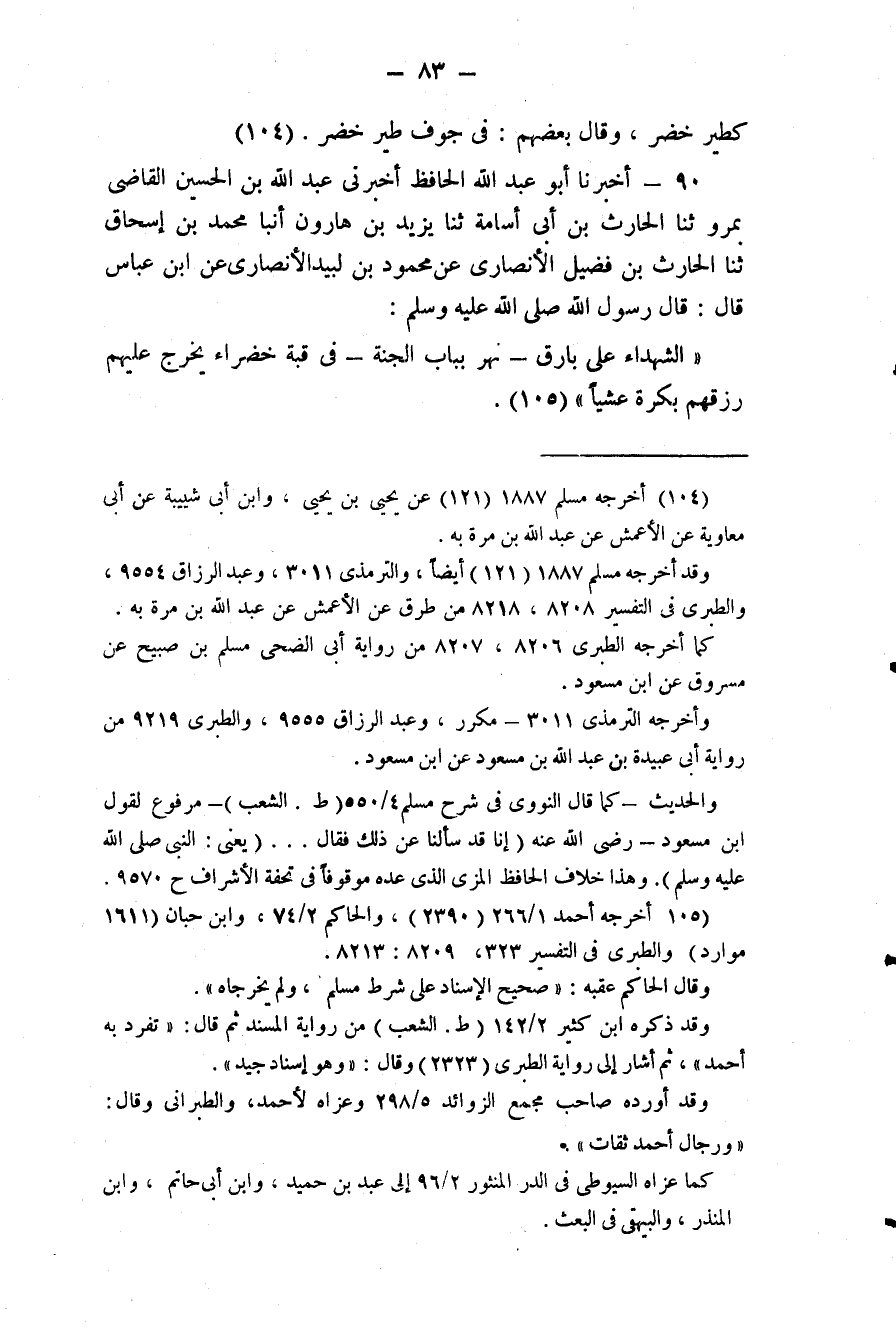 90 - (78) أَخْبَرَنَا أَبُو عَبْدِ اللَّهِ الْحَافِظُ، أَخْبَرَنِي عَبْدُ اللَّهِ بْنُ الْحُسَيْنِ الْقَاضِي، بِمَرْوَ، ثَنَا الْحَارِثُ بْنُ أَبِي أُسَامَةَ، ثَنَا يَزِيدُ بْنُ هَارُونَ، أَنَبا مُحَمَّدُ بْنُ إِسْحَاقَ، ثَنَا الْحَارِثُ بْنُ فُضَيْلٍ الْأَنْصَارِيُّ، عَنْ مَحْمُودَ بْنِ لُبَيْدٍ الأَنْصَارِىُّ عَنِ ابْنِ عَبَّاسٍ قَالَ: قَالَ رَسُولُ اللَّهِ صَلَّى اللهُ عَلَيْهِ وَسَلَّمَ: «الشُّهَدَاءُ عَلَى بَارِقِ - نَهْرٍ بِبَابِ الْجَنَّةِ - فِي قُبَّةٍ خَضْرَاءَ يَخْرُجُ عَلَيْهِمْ رِزَقُهُمْ بُكْرَةً عَشِيًّا»