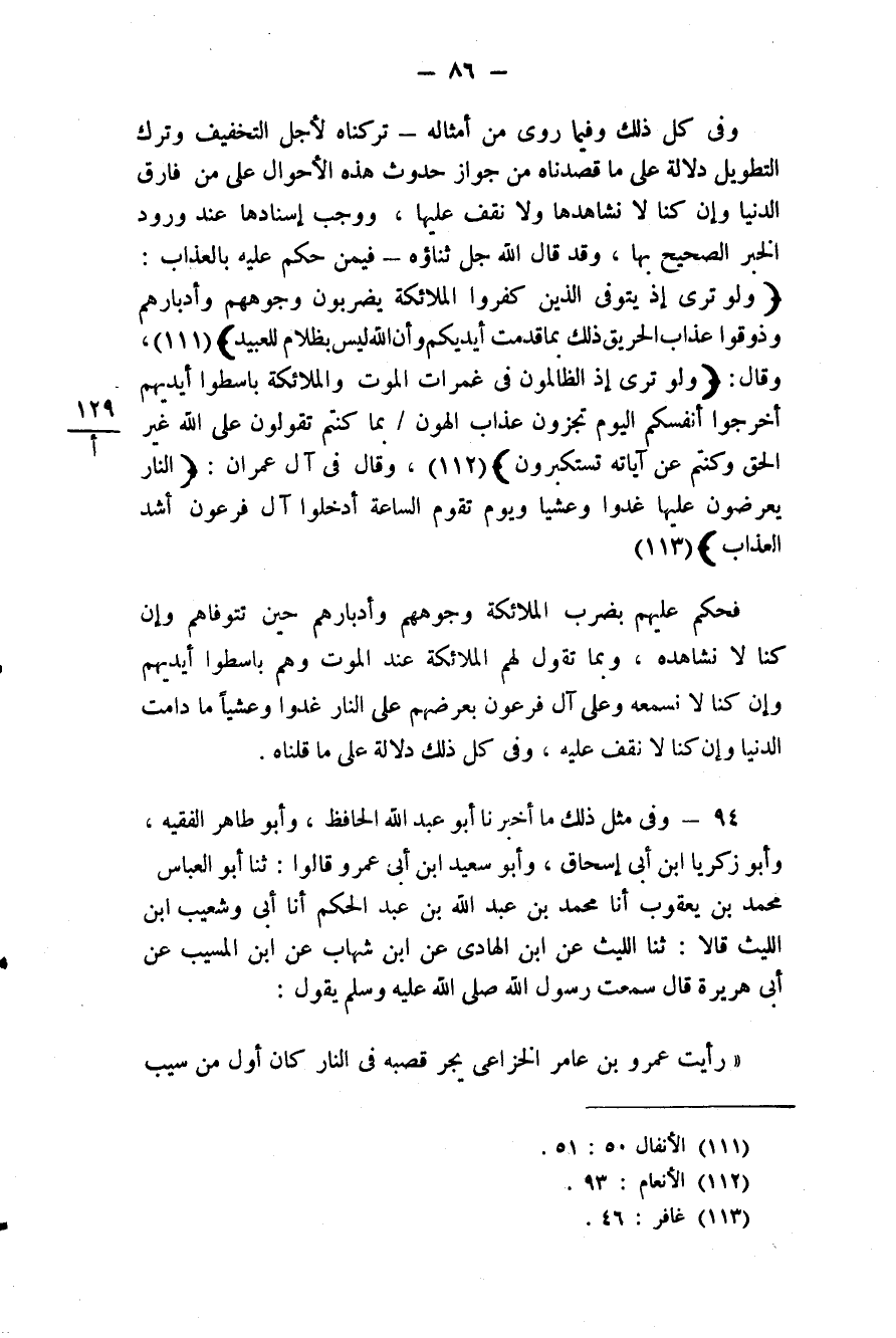 94 - (82) وَفِي مِثْلِ ذَلِكَ مَا أَخْبَرَنَا أَبُو عَبْدِ اللَّهِ الْحَافِظُ، وَأَبُو طَاهِرٍ الْفَقِيهُ، وَأَبُو زَكَرِيَّا بْنُ أَبِي إِسْحَاقَ، وَأَبُو سَعِيدِ بْنُ أَبِي عَمْرٍو قَالُوا: ثَنَا أَبُو الْعَبَّاسِ مُحَمَّدُ بْنُ يَعْقُوبَ، أَنَا مُحَمَّدُ بْنُ عَبْدِ اللَّهِ بْنِ عَبْدِ الْحَكَمِ، أَنَا أَبِي، وَشُعَيْبُ بْنُ اللَّيْثِ قَالَا: ثَنَا اللَّيْثُ، عَنِ ابْنِ الْهَادِي، عَنِ ابْنِ شِهَابٍ، عَنِ ابْنِ الْمُسَيِّبِ، عَنْ أَبِي هُرَيْرَةَ قَالَ: سَمِعْتُ رَسُولَ اللَّهِ صَلَّى اللهُ عَلَيْهِ وَسَلَّم يَقُولُ: «رَأَيْتُ عَمْرَو بْنَ عَامِرٍ الْخُزَاعِيَّ يَجُرُّ قُصَبَهُ فِي النَّارِ كَانَ أَوَّلَ مِنْ سَيَّبَ #87# السَّائِبَةَ»