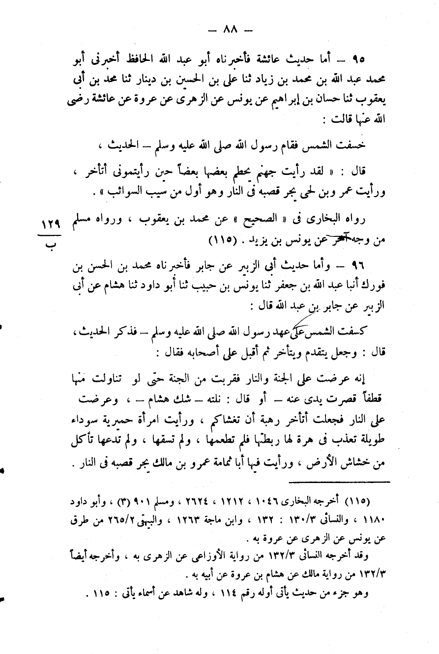 95 - (83) أَمَّا حَدِيثُ عَائِشَةَ، فَأَخْبَرَنَاهُ أَبُو عَبْدِ اللَّهِ الْحَافِظُ، أَخْبَرَنِي أَبُو مُحَمَّدٍ عَبْدُ اللَّهِ بْنُ مُحَمَّدِ بْنِ زِيَادٍ، ثَنَا عَلِيُّ بْنُ الْحُسَيْنِ بْنِ دِينَارٍ، ثَنَا مُحَمَّدُ بْنُ أَبِي يَعْقُوبَ، ثَنَا حَسَّانُ بْنُ إِبْرَاهِيمَ، عَنْ يُونُسَ، عَنِ الزُّهْرِيِّ، عَنْ عُرْوَةَ، عَنْ عَائِشَةَ رَضِيَ اللَّهُ عَنْهَا قَالَتْ: خَسَفَتِ الشَّمْسُ فَقَامَ رَسُولُ اللَّهِ صَلَّى اللهُ عَلَيْهِ وَسَلَّمَ، الْحَدِيثُ. قَالَ: «لَقَدْ رَأَيْتُ جَهَنَّمَ يَحْطِمُ بَعْضُهَا بَعْضًا حِينَ رَأَيْتُمُونِي أَتَأَخَّرُ، وَرَأَيْتُ عَمْرَو بْنَ لُحَيٍّ يَجُرُّ قُصَبَهُ فِي النَّارِ وَهُوَ أَوَّلُ مَنْ سَيَّبَ السَّوَائِبَ»
