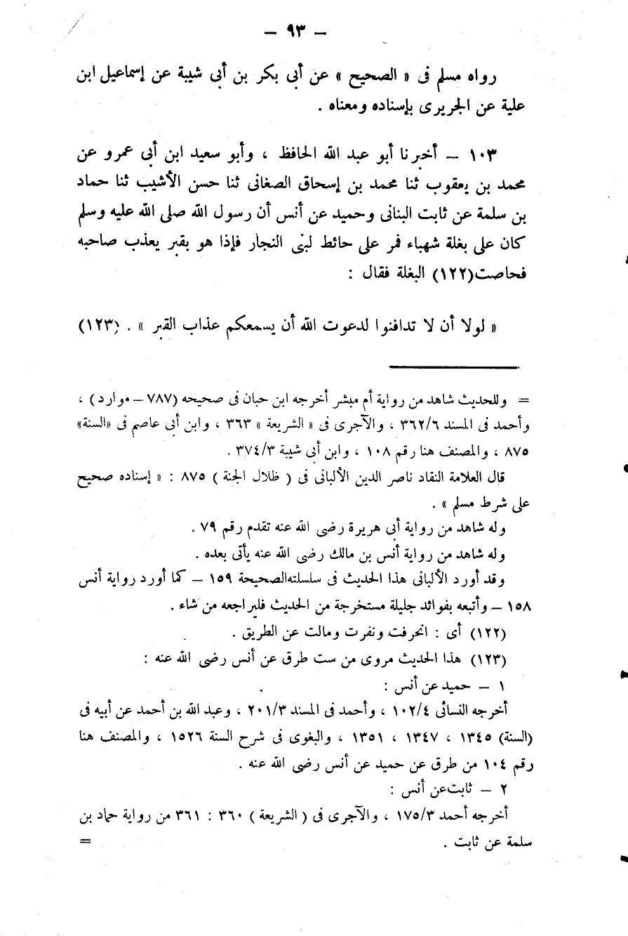 103 - (90) أَخْبَرَنَا أَبُو عَبْدِ اللَّهِ الْحَافِظُ، وَأَبُو سَعِيدِ بْنُ أَبِي عَمْرٍو، عَنْ مُحَمَّدِ بْنِ يَعْقُوبَ، ثَنَا مُحَمَّدُ بْنُ إِسْحَاقَ الصَّغَانِيُّ، ثَنَا حَسَنٌ الْأَشْيَبُ، ثَنَا حَمَّادُ بْنُ سَلَمَةَ، عَنْ ثَابِتٍ الْبُنَانِيِّ، وَحُمَيْدٍ، عَنْ أَنَسٍ أَنَّ رَسُولَ اللَّهِ صَلَّى اللهُ عَلَيْهِ وَسَلَّم كَانَ عَلَى بَغْلَةٍ شَهْبَاءَ فَمَرَّ عَلَى حَائِطٍ لِبَنِي النَّجَّارِ فَإِذَا هُوَ بِقَبْرٍ يُعَذَّبُ صَاحِبُهُ فَحَاصَتِ الْبَغْلَةُ فَقَالَ: «لَوْلَا أَنْ لَا تَدَافَنُوا لَدَعَوْتُ اللَّهَ أَنْ يُسْمِعَكُمْ عَذَابَ الْقَبْرِ»