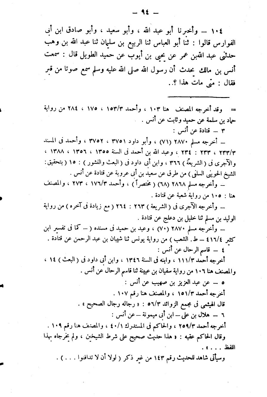 104 - (91) وَأَخْبَرَنَا أَبُو عَبْدِ اللَّهِ، وَأَبُو سَعِيدٍ وَأَبُو صَادِقِ بْنُ أَبِي الْفَوَارِسِ قَالُوا: ثَنَا أَبُو الْعَبَّاسِ، ثَنَا الرَّبِيعُ بْنُ سُلَيْمَانَ، ثَنَا عَبْدُ اللَّهِ بْنُ وَهْبٍ، حَدَّثَنِي عَبْدُ اللَّهِ بْنُ عُمَرَ، عَنْ يحيى بن أيوب عن حُمَيْدٍ الطَّوِيلِ قَالَ: سَمِعْتُ أَنَسَ بْنَ مَالِكٍ، يُحَدِّثُ أَنَّ رَسُولَ اللَّهِ صَلَّى اللهُ عَلَيْهِ وَسَلَّم سَمِعَ صَوْتًا مِنْ قَبْرٍ فَقَالَ: «مَتَى مَاتَ هَذَا؟» #95# قَالُوا: مَاتَ فِي الْجَاهِلِيَّةِ، فَكَأَنَّهُ أَعْجَبَهُ ذَلِكَ فَقَالَ: «لَوْلَا أَنْ لَا تَدَافَنُوا، أَوْ كَمَا قَالَ، لَدَعَوْتُ اللَّهَ عَزَّ وَجَلَّ أَنْ يُسْمِعَكُمْ عَذَابَ الْقَبْرِ»