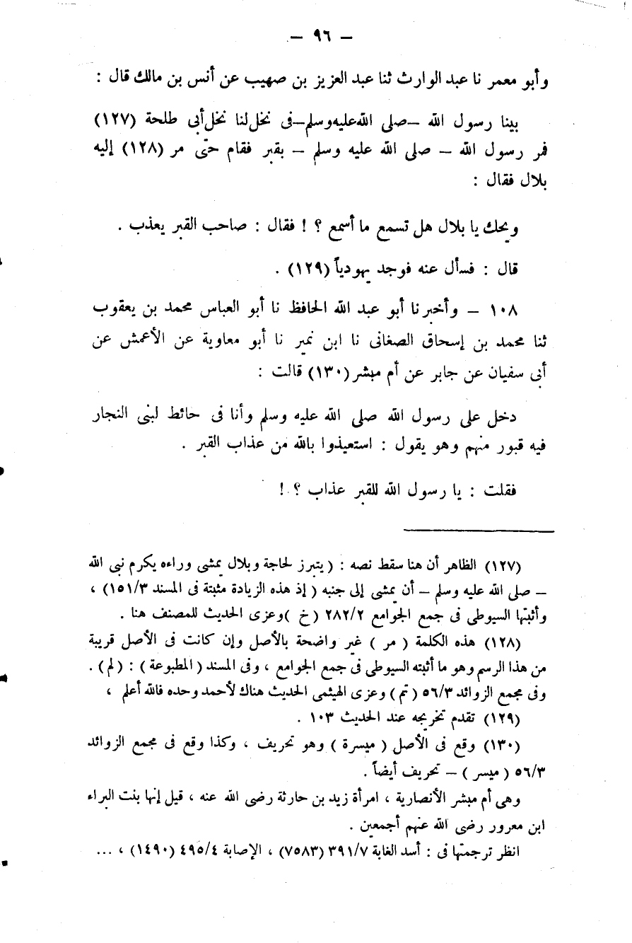 108 - (95) وَأَخْبَرَنَا أَبُو عَبْدِ اللَّهِ الْحَافِظُ، نَا أَبُو الْعَبَّاسِ مُحَمَّدُ بْنُ يَعْقُوبَ، ثَنَا مُحَمَّدُ بْنُ إِسْحَاقَ الصَّغَانِيُّ، نَا ابْنُ نُمَيْرٍ، نَا أَبُو مُعَاوِيَةَ، عَنِ الْأَعْمَشِ، عَنْ أَبِي سُفْيَانَ، عَنْ جَابِرٍ، عَنْ أُمِّ مُبَشِّرٍ قَالَتْ: دَخَلَ عَلَيَّ رَسُولُ اللَّهِ صَلَّى اللهُ عَلَيْهِ وَسَلَّم وَأَنَا فِي حَائِطٍ لِبَنِي النَّجَّارِ فِيهِ قُبُورٌ مِنْهُمْ وَهُوَ يَقُولُ: «اسْتَعِيذُوا بِاللَّهِ مِنْ عَذَابِ الْقَبْرِ» فَقُلْتُ: يَا رَسُولَ اللَّهِ، لِلْقَبْرِ عَذَابٌ؟ #97# فَقَالَ: «إِنَّهُمْ لَيُعَذَّبُونَ فِي قُبُورِهِمْ عَذَابًا تَسْمَعُهُ الْبَهَائِمُ»