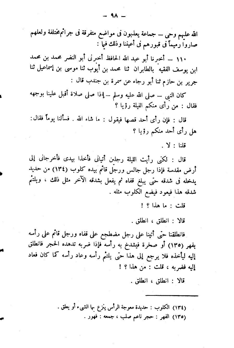 110 - (97) وَذَلِكَ فِيمَا: أَخْبَرَنَا أَبُو عَبْدِ اللَّهِ الْحَافِظُ، أَخْبَرَنِي أَبُو النَّضْرِ مُحَمَّدُ بْنُ مُحَمَّدِ بْنِ يُوسُفَ الْفَقِيهُ بِالطَّابِرَانِ، ثَنَا مُحَمَّدُ بْنُ أَيُّوبَ، ثَنَا مُوسَى بْنُ إِسْمَاعِيلَ، ثَنَا جَرِيرُ بْنُ حَازِمٍ، ثَنَا أَبُو رَجَاءٍ، عَنْ سَمُرَةَ بْنِ جُنْدُبٍ قَالَ: كَانَ النَّبِيُّ صَلَّى اللهُ عَلَيْهِ وَسَلَّم إِذَا صَلَّى صَلَاةً أَقْبَلَ عَلَيْنَا بِوَجْهِهِ فَقَالَ: «مَنْ رَأَى مِنْكُمُ اللَّيْلَةَ رُؤْيَا؟» قَالَ: فَإِنْ رَأَى أَحَدٌ قَصَّهَا، فَيَقُولُ مَا شَاءَ اللَّهُ، فَسَأَلَنَا يَوْمًا فَقَالَ: «هَلْ رَأَى أَحَدٌ مِنْكُمْ رُؤْيَا؟» قُلْنَا: لَا قَالَ: " لَكِنِّي رَأَيْتُ اللَّيْلَةَ رَجُلَيْنِ أَتَيَانِي فَأَخَذَا بِيَدِي فَأَخْرَجَانِي إِلَى أَرْضٍ مُقَدَّسَةٍ، فَإِذَا رَجُلٌ جَالِسٌ وَرَجُلٌ قَائِمٌ بِيَدِهِ كَلُّوبٌ مِنْ حَدِيدٍ يُدْخِلُهُ فِي شِدْقِهِ حَتَّى يَبْلُغَ قَفَاهُ ثُمَّ يَفْعَلُ بِشِدْقِهِ الْآخَرِ مِثْلَ ذَلِكَ وَيَلْتَئِمُ شِدْقُهُ هَذَا فَيَعُودُ فَيَضَعُ الْكَلُّوبَ مِثْلَهُ، قُلْتُ: مَا هَذَا؟ قَالَا: انْطَلِقِ انْطَلِقْ، فَانْطَلَقْنَا حَتَّى أَتَيْنَا عَلَى رَجُلٍ مُضْطَجِعٍ عَلَى قَفَاهُ وَرَجُلٍ قَائِمٍ عَلَى رَاسِهِ بِفِهْرٍ أَوْ صَخْرَةٍ فَيَشْدَخُ بِهِ رَاسَهُ، فَإِذَا ضَرَبَهُ تَدَهْدَهَ الْحَجَرُ فَانْطَلَقَ إِلَيْهِ لِيَاخُذَهُ فَلَا يَرْجِعُ إِلَى هَذَا حَتَّى يَلْتَئِمَ رَاسُهُ وَعَادَ رَاسُهُ كَمَا كَانَ فَعَادَ إِلَيْهِ فَضَرَبَهُ، قُلْتُ: مَنْ هَذَا؟ قَالَا: انْطَلِقِ انْطَلَقْ #99# فَانْطَلَقْنَا إِلَى بَيْتٍ مِثْلِ التَّنُّورِ أَعْلَاهُ ضَيِّقٌ وَأَسْفَلُهُ وَاسِعٌ يَتَوَقَّدُ تَحْتَهُ نَارًا، فَإِذَا اقْتَرَبْتِ ارْتَفَعُوا حَتَّى كَادُوا أَنْ يَخْرُجُوا، فَإِذَا خَمَدَتْ رَجَعُوا فِيهَا وَفِيهَا رِجَالٌ وَنِسَاءٌ عُرَاةٌ، فَقُلْتُ: مَا هَذَا؟ قَالَا: انْطَلِقِ فَانْطَلَقْنَا حَتَّى أَتَيْنَا عَلَى نَهَرٍ مِنْ دَمٍ فِيهِ رَجُلٌ قَائِمٌ عَلَى شَاطِئِ النَّهَرِ وَرَجُلٌ بَيْنَ يَدَيْهِ حِجَارَةٌ، فَأَقْبَلَ الرَّجُلُ الَّذِي فِي النَّهَرِ فَأَرَادَ أَنْ يَخْرُجَ؛ فَرَمَى الرَّجُلَ بِحَجَرٍ فِي فِيهِ فَرَدَّهُ حَيْثُ كَانَ، فَجَعَلَ كُلَّمَا أَرَادَ أَنْ يَخْرُجَ؛ رَمَى فِي فِيهِ بِحَجَرٍ فَيَرْجِعُ كَمَا كَانَ، فَقُلْتُ: مَا هَذَا؟ قَالَا: انْطَلِقْ فَانْطَلَقْنَا حَتَّى أَتَيْنَا إِلَى رَوْضَةٍ خَضْرَاءَ فِيهَا شَجَرَةٌ عَظِيمَةٌ وَفِي أَصْلِهَا شَيْخٌ وَصِبْيَانٌ، وَإِذَا رَجُلٌ قَرِيبٌ مِنَ الشَّجَرَةِ بَيْنَ يَدَيْهِ نَارٌ يُوقِدُهَا فَصَعِدُابِيَ إِلَى الشَّجَرَةِ وَأَدْخِلَانِي دَارًا لَمْ أَرْ قَطُّ أَحْسَنَ مِنْهَا، فِيهَا رِجَالٌ شُيُوخٌ، وَشَبَابٌ وَنِسَاءٌ وَصِبْيَانٌ، ثُمَّ أَخْرَجَانِي مِنْهَا فَصَعِدَا بِي الشَّجَرَةِ فَأَدْخَلَانِي دَارًا هِيَ أَفْضَلُ وَأَحْسَنُ، فِيهَا شُيُوخٌ وَشَبَابٌ، قُلْتُ: طَوَّفْتُمَانِي اللَّيْلَةَ فَأَخْبِرَانِي عَمَّا رَأَيْتُ قَالَا: نَعَمْ، الَّذِي رَأَيْتَهُ يَشُقُّ شِدْقَهُ فَكَذَّابٌ يُحَدِّثُ بِالْكَذْبَةِ فَتُحْمَلُ عَنْهُ حَتَّى تَبْلُغَ الْآفَاقَ فَيُصْنَعَ بِهِ إِلَى يَوْمِ الْقِيَامَةِ، وَالَّذِي رَأَيْتَهُ يَشْدَخُ رَاسَهُ فَرَجُلٌ عَلَّمَهُ اللَّهُ الْقُرْآنَ فَنَامَ عَنْهُ بِاللَّيْلِ وَلَمْ يَعْمَلْ فِيهِ بِالنَّهَارِ، يَفْعَلُ بِهِ إِلَى يَوْمِ الْقِيَامَةِ، وَالَّذِي رَأَيْتَهُ فِي الثَّقْبِ فَهُمُ الزُّنَاةُ، وَالَّذِي رَأَيْتَهُ فِي النَّهَرِ آكِلُوا الرِّبَا وَالشَّيْخُ فِي أَصْلِ الشَّجَرَةِ إِبْرَاهِيمُ عَلَيْهِ السَّلَامُ، وَالصِّبْيَانُ حَوْلَهُ أَوْلَادُ النَّاسِ، وَالَّذِي يُوقِدُ 
