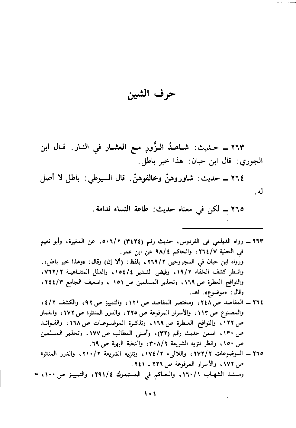 263 - حَدِيث: شَاهد الزُّور مَعَ العشار فِي النَّار. قَالَ ابْن الْجَوْزِيّ: قَالَ ابْن حبَان: هَذَا خبر بَاطِل.