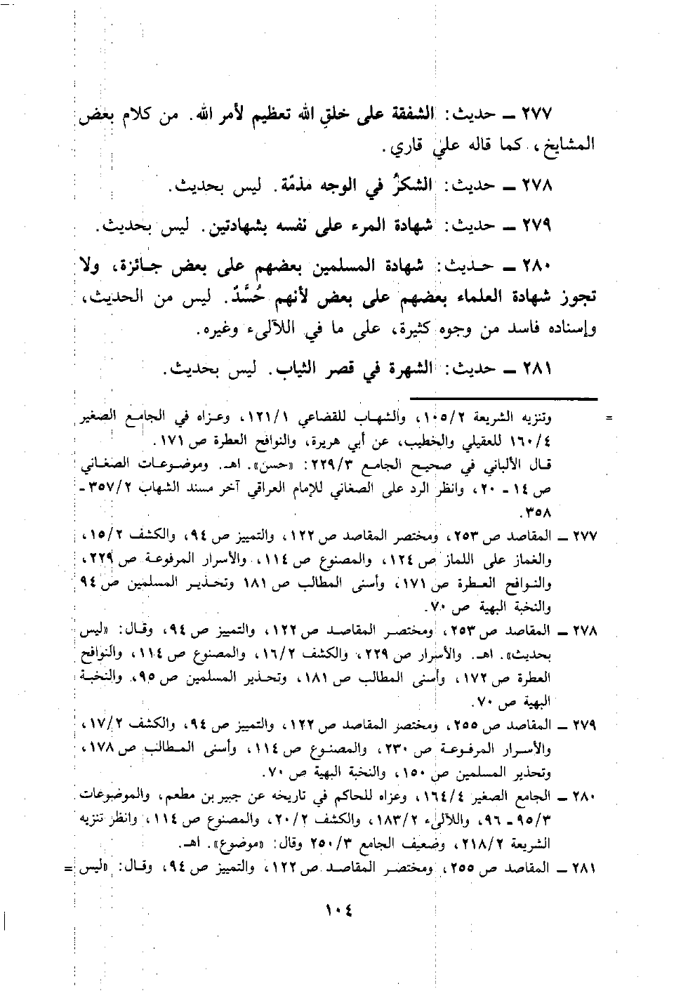 280 - حَدِيث: شَهَادَة الْمُسلمين بَعضهم على بعض جَائِزَة، وَلَا تجوز شَهَادَة الْعلمَاء بَعضهم على بعض لِأَنَّهُ حسد. لَيْسَ من الحَدِيث، وَإِسْنَاده فَاسد من وُجُوه كَثِيرَة، على مَا فِي اللآلئ وَغَيره.