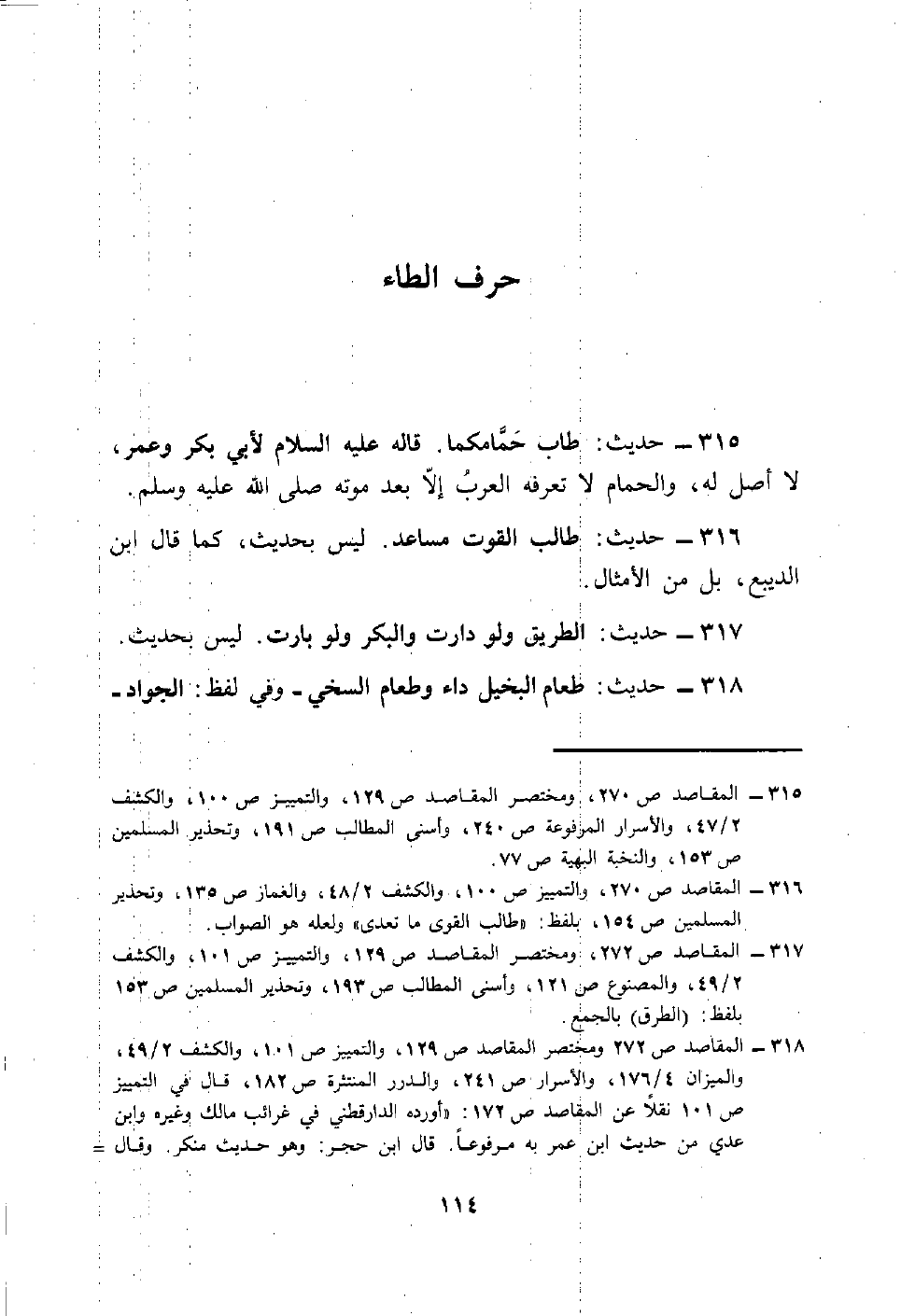 315 - حَدِيث: طَابَ حمَّامكما. قَالَه عَلَيْهِ السَّلَام لأبي بكر وَعمر، لَا أصل لَهُ، وَالْحمام لَا تعرفه الْعَرَب إِلَّا بعد مَوته صلى الله عَلَيْهِ وَسلم.