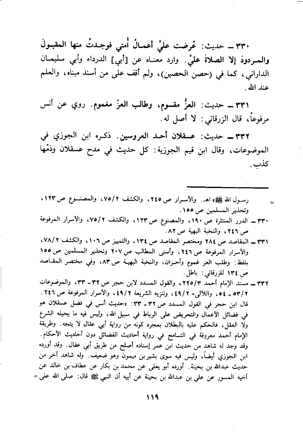 332 - حَدِيث: عسقلان أحد العروسين. ذكره ابْن الْجَوْزِيّ فِي الموضوعات، وَقَالَ ابْن قيم الجوزية: كل حَدِيث فِي مدح عسقلان وذمها كذب.