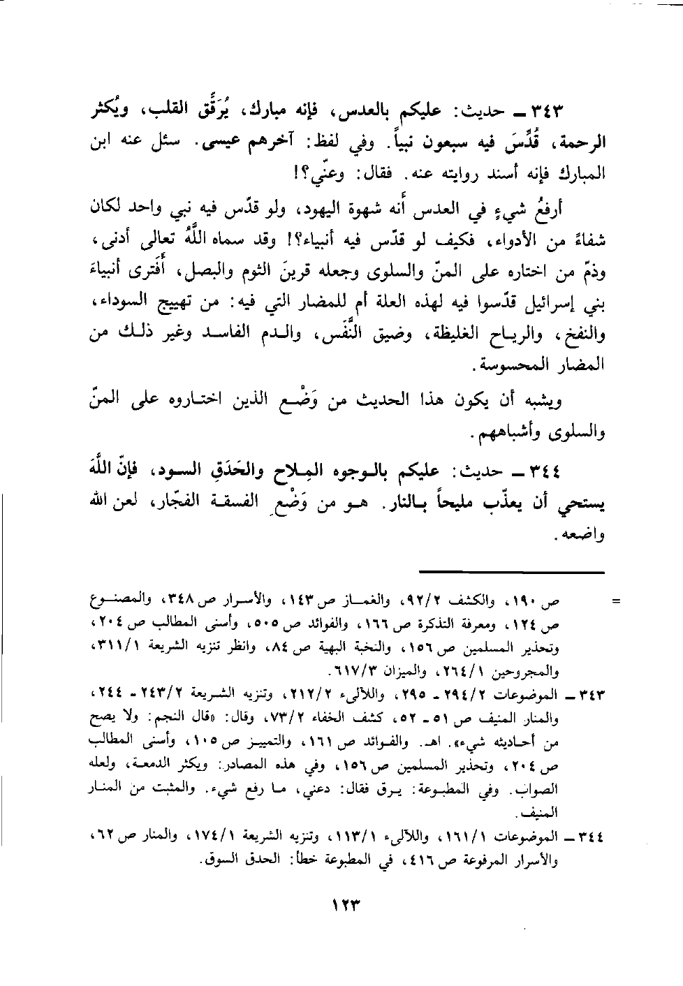343 - حَدِيث: عَلَيْكُم بالعدس، فَإِنَّهُ مبارك، يرقق الْقلب، وَيكثر الرَّحْمَة، قدس فِيهِ سَبْعُونَ نَبيا. وَفِي لفظ: آخِرهم عِيسَى. سُئِلَ عَنهُ ابْن الْمُبَارك فَإِنَّهُ أسْند رِوَايَته عَنهُ. فَقَالَ: وعني؟ {