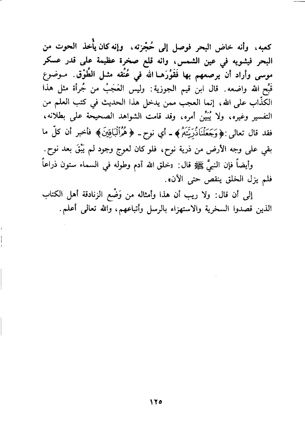 كَعبه، وَأَنه خَاضَ الْبَحْر فوصل إِلَى حجزته، وَإنَّهُ كَانَ يَأْخُذ الْحُوت من الْبَحْر فيشويه فِي عين الشَّمْس، وَإنَّهُ قلع صَخْرَة عَظِيمَة على قدر عَسْكَر مُوسَى وَأَرَادَ أَن يرصعهم بهَا فقورها الله فِي عُنُقه مثل الطوق. مَوْضُوع قبح الله وَاضعه. قَالَ ابْن قيم الجوزية: وَلَيْسَ الْعجب من جرْأَة مثل هَذَا الْكذَّاب على الله، إِنَّمَا الْعجب مِمَّن يدْخل هَذَا الحَدِيث فِي كتب الْعلم من التَّفْسِير وَغَيره، وَلَا يبين أمره، وَقد قَامَت الشواهد الصَّحِيحَة على بُطْلَانه، فقد قَالَ تَعَالَى: {وَجَعَلنَا ذُريَّته} - أَي نوح - {هم البَاقِينَ} فَأخْبر أَن كل مَا بَقِي على وَجه الأَرْض من ذُرِّيَّة نوح، فَلَو كَانَ لعوج وجود لم يبْق بعد نوح.