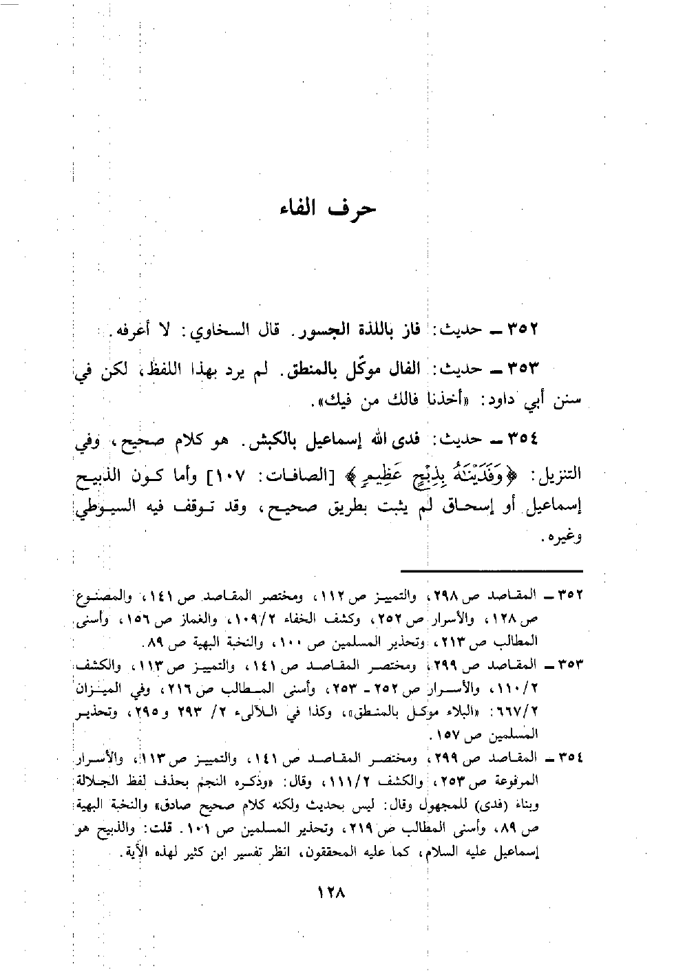354 - حَدِيث: فدى الله إِسْمَاعِيل بالكبش. هُوَ كَلَام صَحِيح، وَفِي التَّنْزِيل: {وفديناه بِذبح عَظِيم} [الصافات: 107] وَأما كَون الذَّبِيح إِسْمَاعِيل أَو إِسْحَاق لم يثبت بطرِيق صَحِيح، وَقد توقف فِيهِ السُّيُوطِيّ وَغَيره.