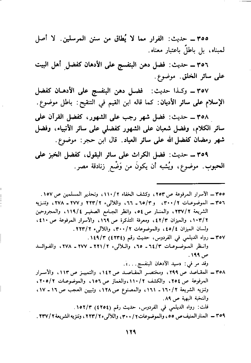 357 - وَكَذَا حَدِيث: فضل دهن البنفسج على الأدهان كفضل الْإِسْلَام على سَائِر الْأَدْيَان: كَمَا قَالَه ابْن الْقيم فِي التَّنْقِيح: بَاطِل مَوْضُوع.