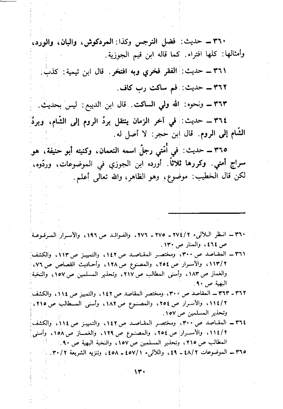 365 - حَدِيث: فِي أمتِي رجل اسْمه النُّعْمَان، وكنيته أَبُو حنيفَة، هُوَ سراج أمتِي. وكررها ثَلَاثًا. أوردهُ ابْن الْجَوْزِيّ فِي الموضوعات، وردوه، لَكِن قَالَ الْخَطِيب: مَوْضُوع، وَهُوَ الظَّاهِر، وَالله تَعَالَى أعلم.