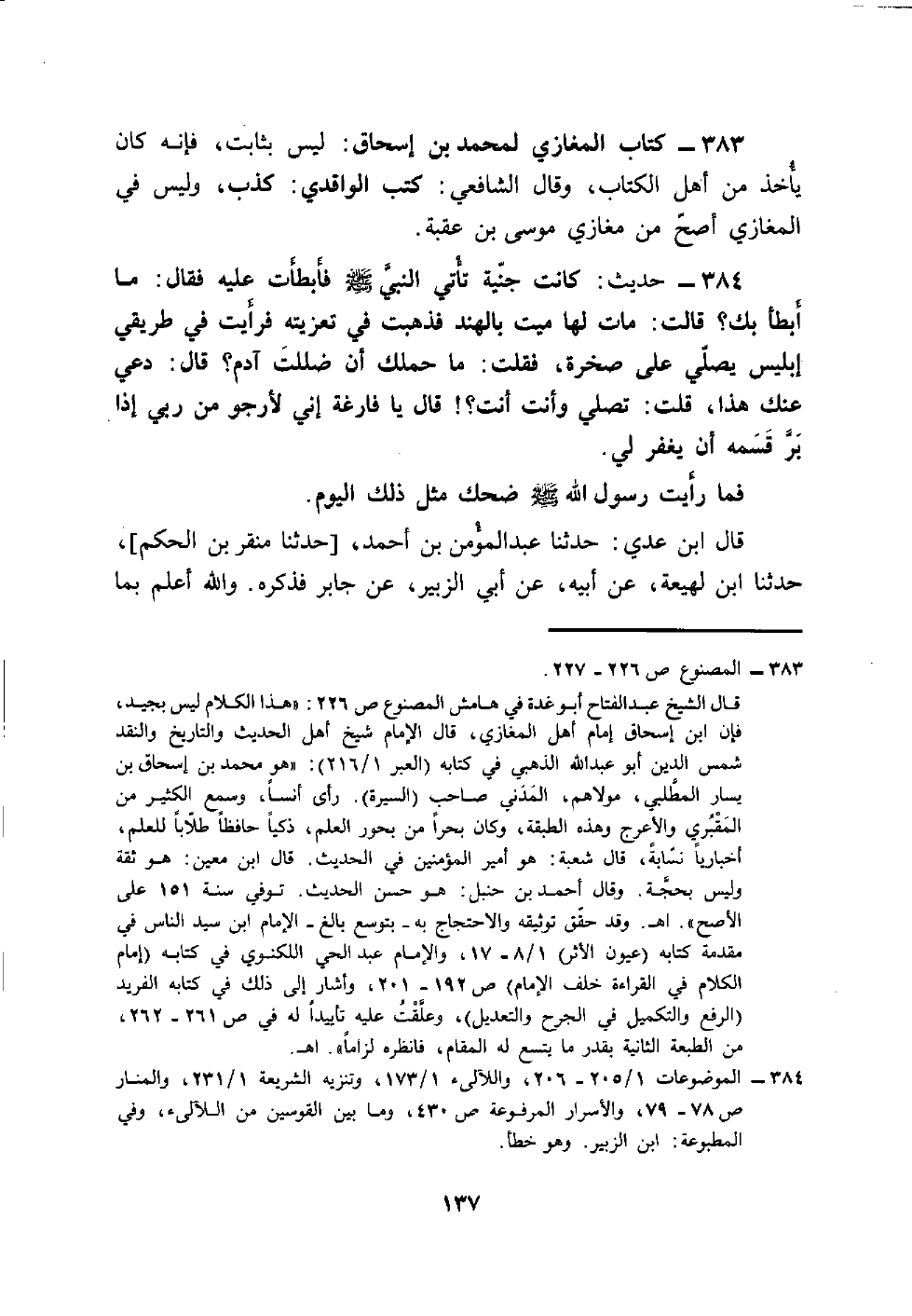 383 - كتاب الْمَغَازِي لمُحَمد بن إِسْحَاق: لَيْسَ بِثَابِت، فَإِنَّهُ كَانَ يَأْخُذ من أهل الْكتاب، وَقَالَ الشَّافِعِي: كتب الْوَاقِدِيّ: كذب، وَلَيْسَ فِي الْمَغَازِي أصح من مغازي مُوسَى بن عقبَة.