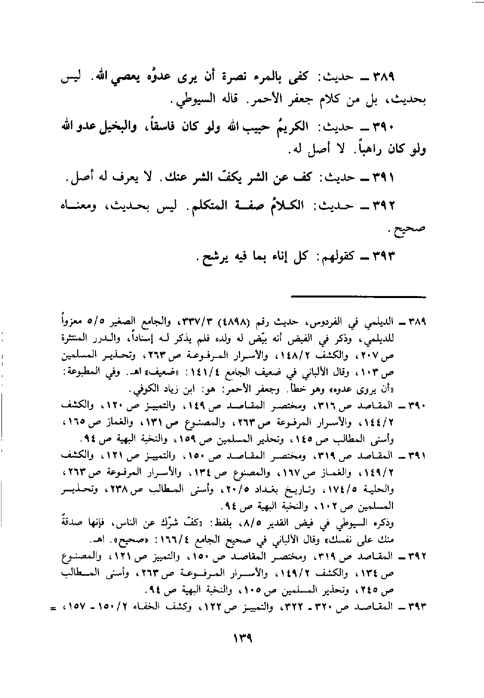 389 - حَدِيث: كفى بِالْمَرْءِ نصْرَة أَن يرى عدوه يَعْصِي الله. لَيْسَ بِحَدِيث، بل من كَلَام جَعْفَر الْأَحْمَر. قَالَه السُّيُوطِيّ.