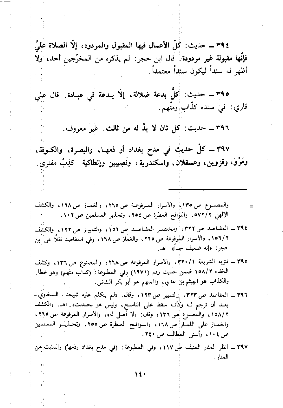 397 - كل حَدِيث فِي مدح بَغْدَاد أَو ذمها، وَالْبَصْرَة، والكوفة، ومرو، وقزوين، وعسقلان، واسكندرية، ونصيبين وإنطاكية. كذب مفترى.
