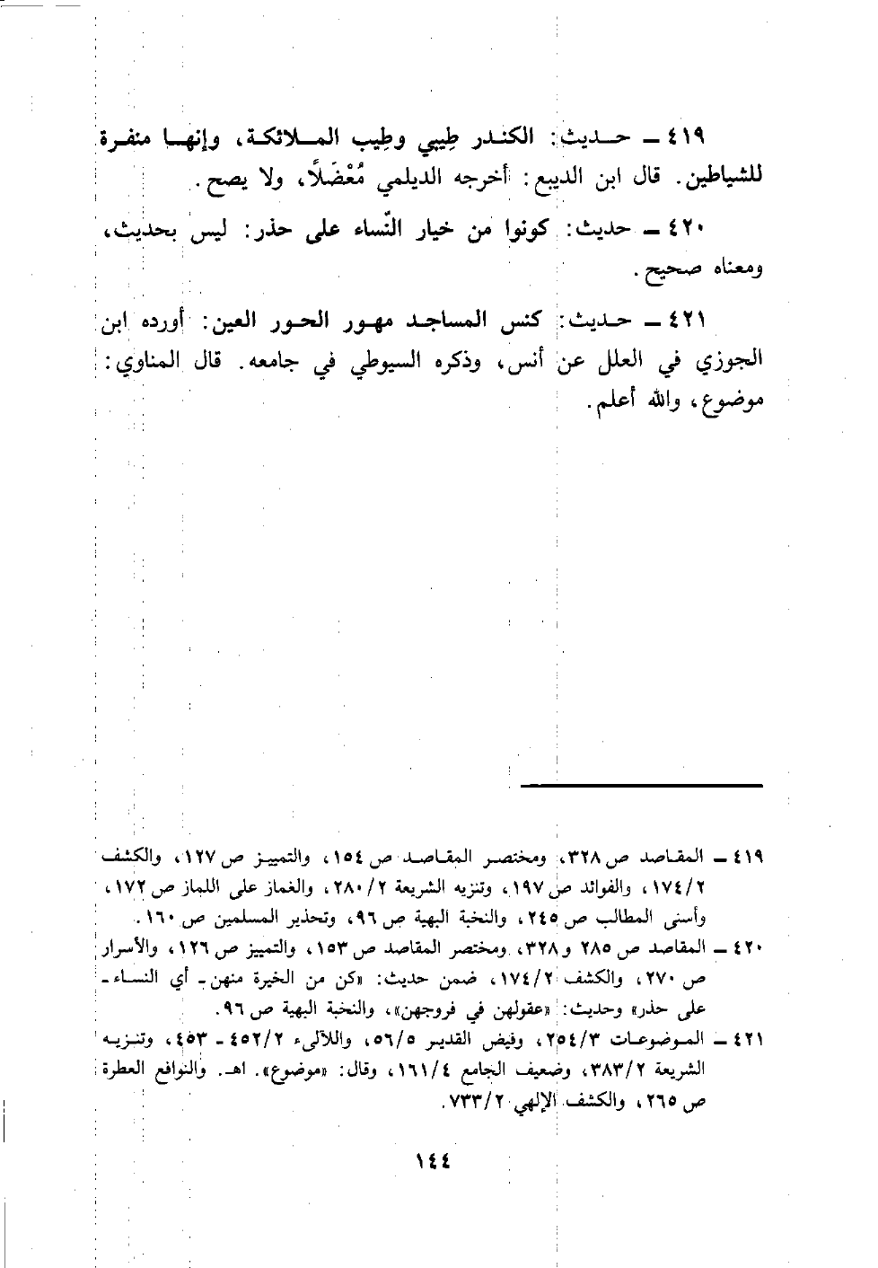 421 - حَدِيث: كنس الْمَسَاجِد مُهُور الْحور الْعين: أوردهُ ابْن الْجَوْزِيّ فِي الْعِلَل عَن أنس، وَذكره السُّيُوطِيّ فِي جَامعه. قَالَ الْمَنَاوِيّ: مَوْضُوع، وَالله أعلم.