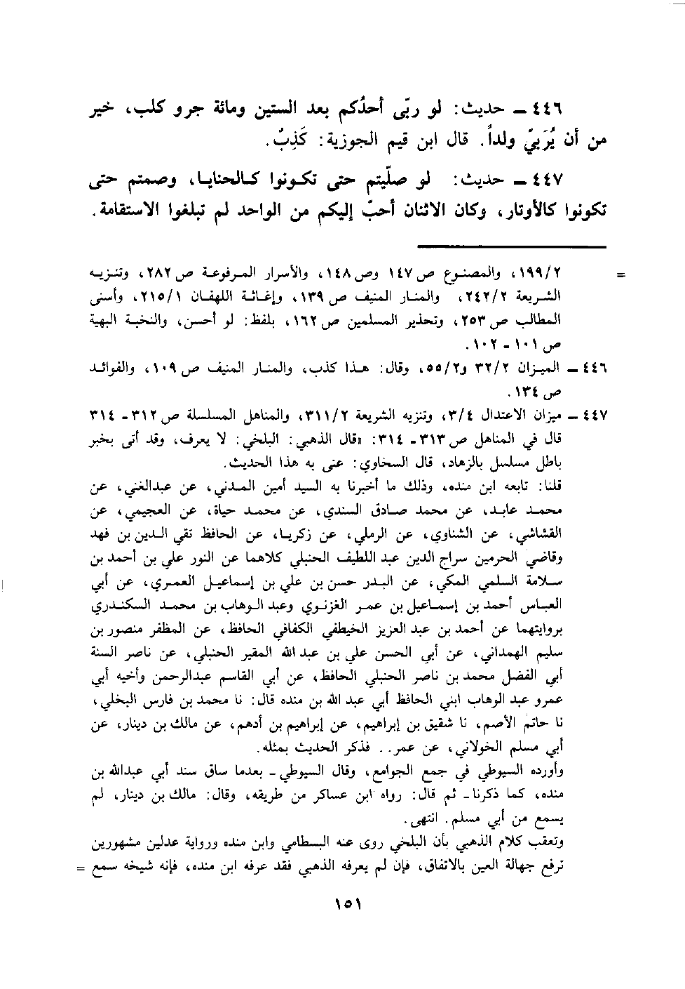 446 - حَدِيث: لَو ربى أحدكُم بعد السِّتين وَمِائَة جرو كلب، خير من أَن يُربي ولدا. قَالَ ابْن قيم الجوزية: كذب.