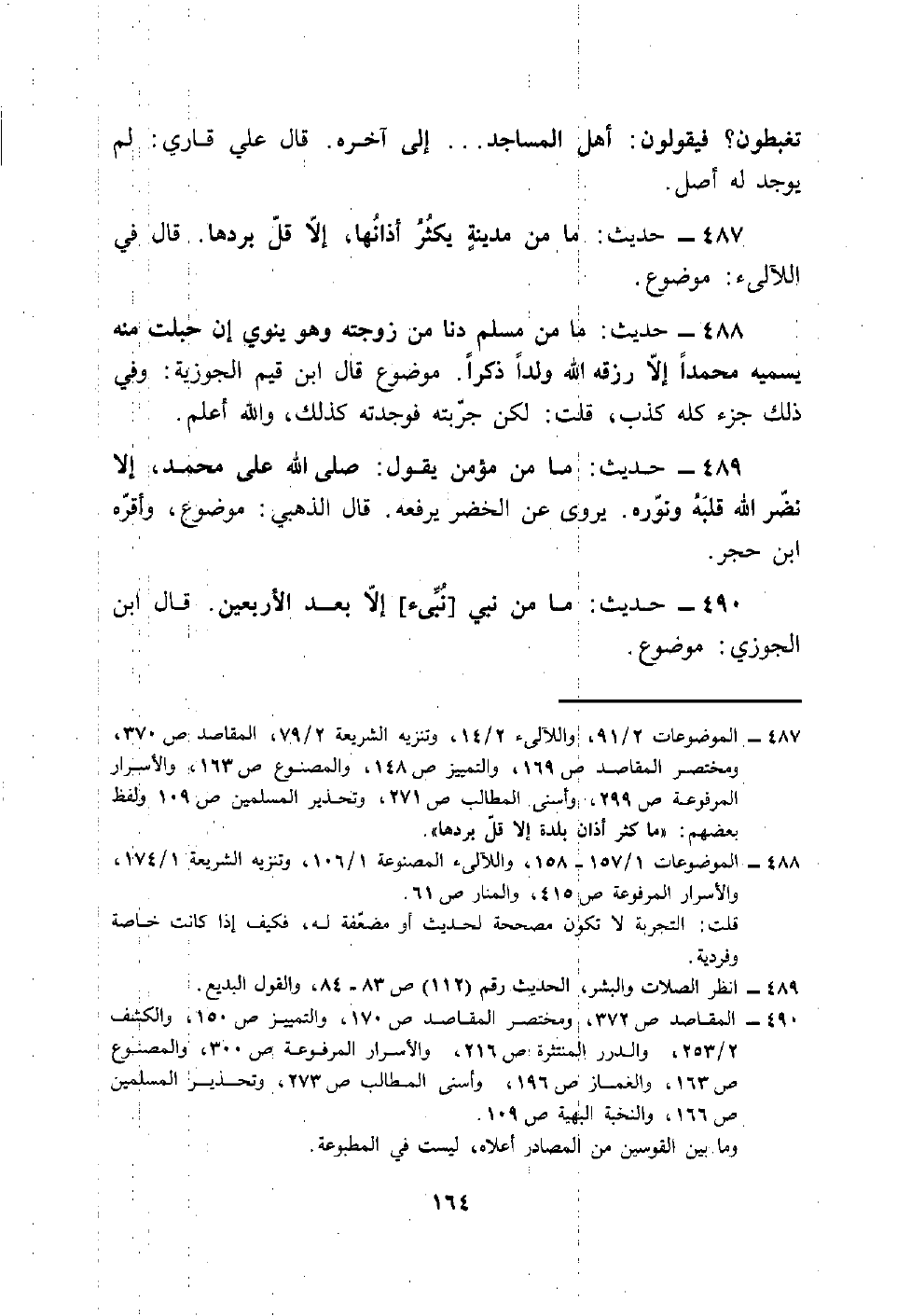 488 - حَدِيث: مَا من مُسلم دنا من زَوجته وَهُوَ يَنْوِي إِن حبلت مِنْهُ يُسَمِّيه مُحَمَّدًا إِلَّا رزقه الله ولدا ذكرا. مَوْضُوع قَالَ ابْن قيم الجوزية: وَفِي ذَلِك جُزْء كُله كذب، قلت: لَكِن جربته فَوَجَدته كَذَلِك، وَالله أعلم.