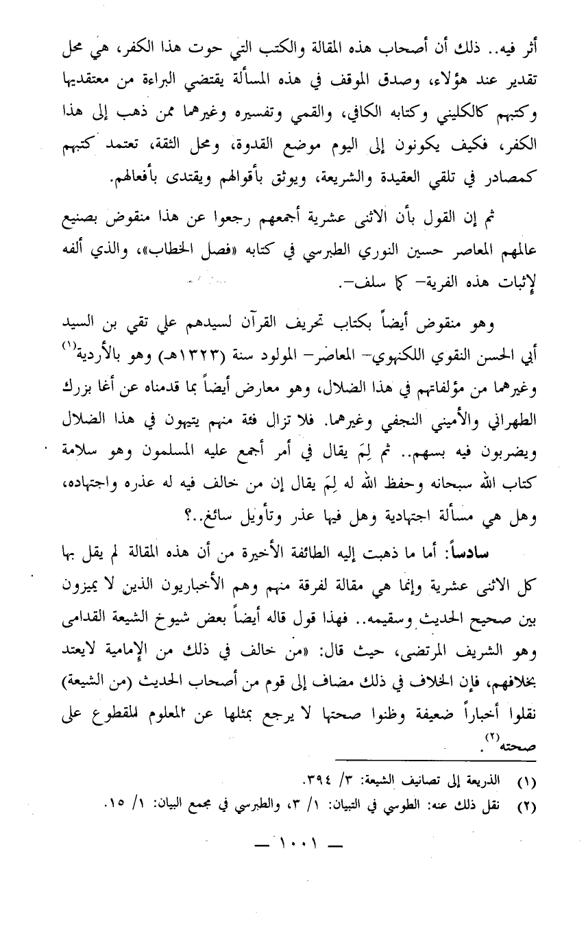 وهو منقوض أيضاً بكتاب تحريف القرآن لسيدهم علي تقي بن السيد أبي الحسن النقوي اللكنهوي - المعاصر -المولود سنة (1323هـ) وهو بالأردية (¬1) . وغيرهما من مؤلفاتهم في هذا الضلال، وهو معارض أيضاً بما قدمناه عن أغا بزرك الطهراني والأميني النجفي وغيرهما. فلا تزال فئة منهم يتيهون في هذا الضلال ويضربون فيه بسهم.. ثم لِمَ يقال في أمر أجمع عليه المسلمون وهو سلامة كتاب الله سبحانه وحفظ الله له لِمَ يقال إن من خالف فيه له عذره واجتهاده، وهل هي مسألة اجتهادية، وهل فيها عذر وتأويل سائغ..؟