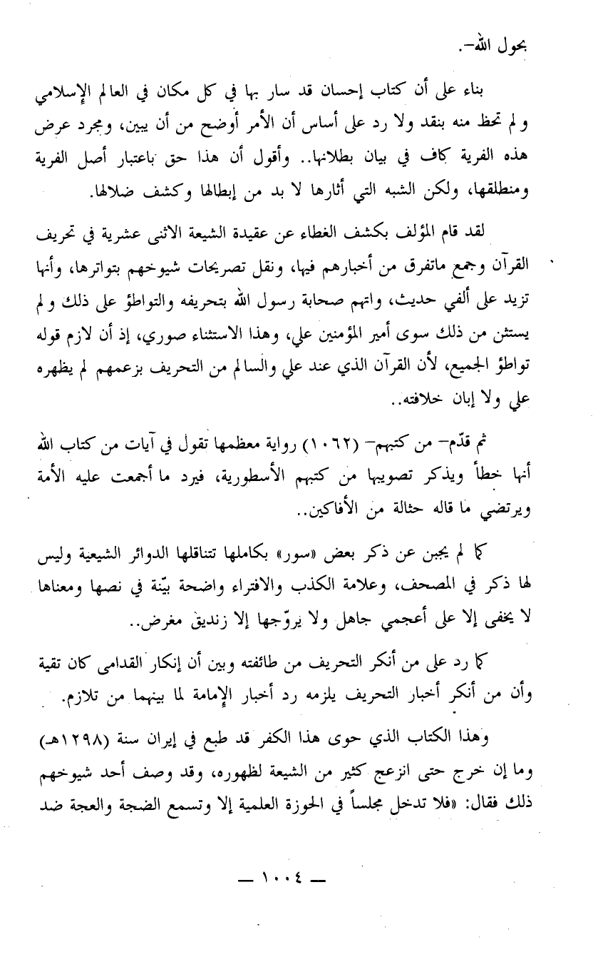 ثم قدّم - من كتبهم - (1062) رواية معظمها تقول في آيات من كتاب الله أنها خطأ ويذكر تصويبها من كتبهم الأسطورية، فيرد ما أجمعت عليه الأمة ويرتضي ما قاله حثالة من الأفاكين.