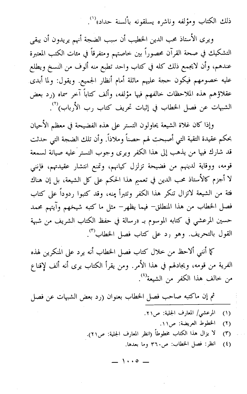 وإذا كان غلاة الشيعة يحاولون التستر علي هذه الفضيحة في معظم الأحيان بحكم عقيدة التقية التي أصبحت لهم حصناً وملاذاً، وأن تلك الضجة التي حدثت قد شارك فيها من يذهب إلى هذا الكفر ويرى وجوب التستر عليه صيانة لسمعة قومه، ووقاية لدينهم من فضيحة تزلزل كيانهم، وتمنع انتشار عقيدتهم، فإنني لا أجزم كالأستاذ محب الدين في تعميم هذا الحكم على كل الشيعة، بل إن هناك فئة من الشيعة لا تزال تنكر هذا الكفر وتتبرأ منه، وقد كتبوا ردوداً على كتاب فصل الخطاب من هذا المنطلق - فيما يظهر - مثل ما كتبه شيخهم وآيتهم محمد حسين المرعشي في كتابه الموسوم ب"رسالة حفظ الكتاب الشريف من شبهة القول بالتحريف" وهو رد على كتاب فصل الخطاب (¬3) .