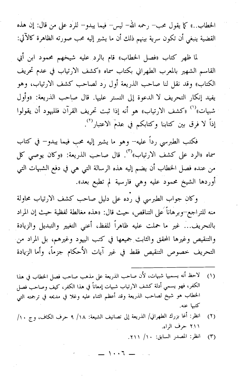 (¬1) لا حظ أنه يسميها شبهات؛ لأن صاحب الذريعة على مذهب صاحب فصل الخطاب في هذا الكفر، فهو يسمي أدلة كشف الارتياب شبهات إمعانًا في الكفر، كيف وصاحب فصل الخطاب هو شيخ لصاحب الذريعة وقد أعظم الثناء عليه وغلا في مديحه في ترجمته التي كتبها عنه