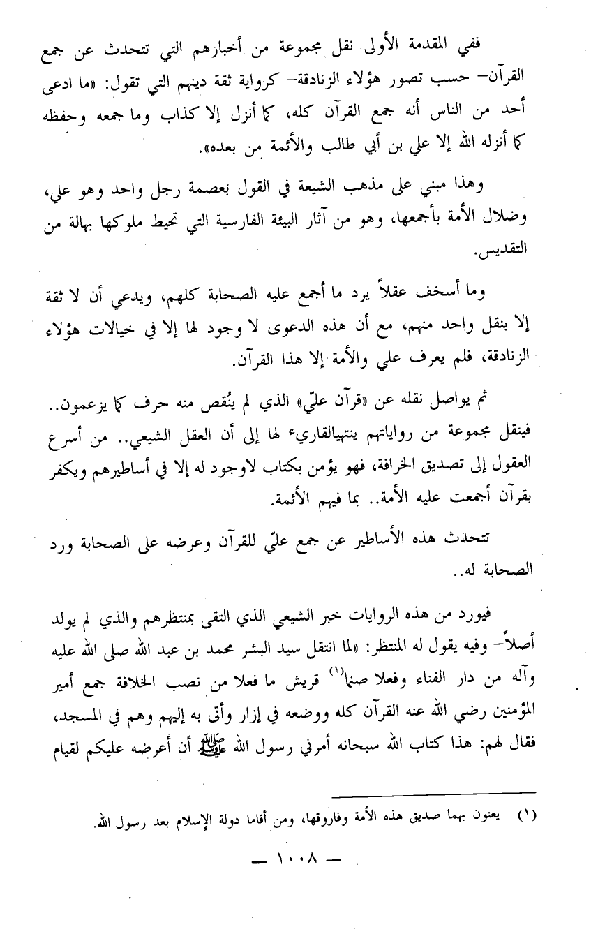 ثم يواصل نقله عن "قرآن علي" الذي لم يُنقص منه حرف كما يزعمون.. فينقل مجموعة من رواياتهم ينتهي القارئ لها إلى أن العقل الشيعي.. من أسرع العقول إلى تصديق الخرافة، فهو يؤمن بكتاب لا وجود له إلا في أساطيرهم ويكفر بقرآن أجمعت علية الأمة.. بما فيهم الأئمة.