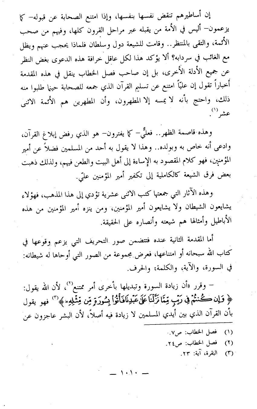 وقرر "أن زيادة السورة وتبديلها بأخرى أمر ممتنع (¬2) .؛ لأن الله يقول: {وَإِن كُنتُمْ فِي رَيْبٍ مِّمَّا نَزَّلْنَا عَلَى عَبْدِنَا فَأْتُواْ بِسُورَةٍ مِّن مِّثْلِهِ} (¬3) فهو يقول بأن القرآن الذي بين أيدي المسلمين لا زيادة فيه أصلاً؛ لأن البشر عاجزون عن الإتيان