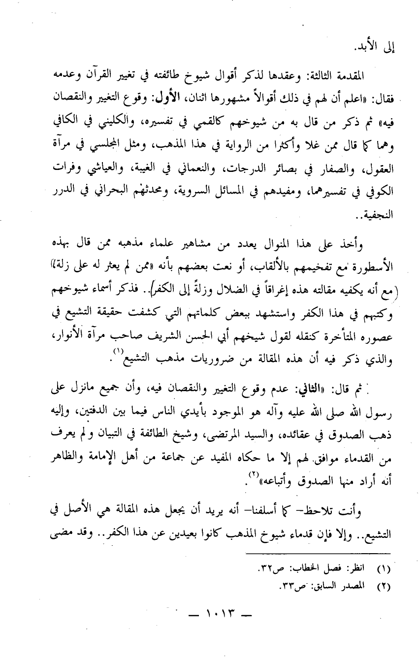 المقدمة الثالثة: وعقدها لذكر أقول شيوخ طائفته في تغيير القرآن وعدمه فقال: "اعلم أن لهم في ذلك أقوالاً مشهورها اثنان: الأول: وقوع التغيير والنقصان فيه" ثم ذكر من قال به من شيوخهم كالقمي في تفسيره، والكليني في الكافي وهما كما قال ممن غلا وأكثرا من الرواية في هذا المذهب، ومثل المجلسي في مرآة العقول، والصفار في بصائر الدرجات، والنعماني في الغيبة، والعياشي وفرات الكوفي في تفسيرهما، ومفيدهم في المسائل السروية، ومحدثهم البحراني في الدرر النجفية.