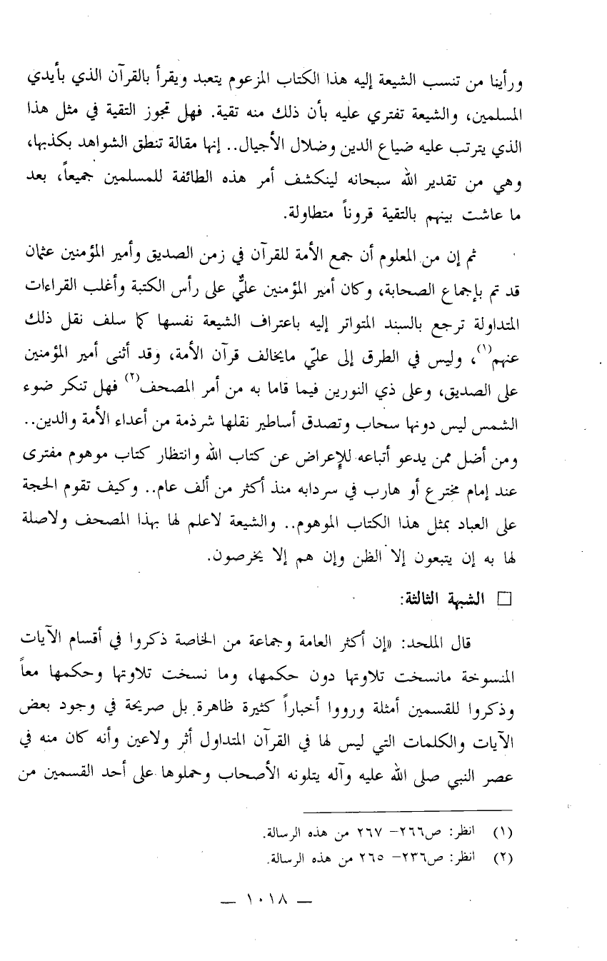 ثم إن من العلوم أن جمع الأمة للقرآن في زمن الصديق وأمير المؤمنين عثمان قد تم بإجماع الصحابة، وكان أمير المؤمنين عليٌّ على رأس الكتبة وأغلب القراءات المتداولة ترجع بالسند المتواتر إليه باعتراف الشيعة نفسها كما سلف نقل ذلك عنهم (¬1) ، وليس في الطرق إلى علي ّما يخالف قرآن الأمة، وقد أثنى أمير المؤمنين على الصديق، وعلى ذي النورين فيما قاما به من أمر المصحف (¬2) . فهل تنكر ضوء الشمس ليس دونها سحاب وتصدق أساطير نقلها شرذمة من أعداء الأمة والدين؟! ومن أضل ممن يدعو أتباعه للإعراض عن كتاب الله وانتظار كتاب موهوم مفترى عند إمام مخترع أو هارب في سردابه منذ أكثر من ألف عام.. وكيف تقوم الحجة على العباد بمثل هذا الكتاب الموهوم.. والشيعة لا علم لها بهذا المصحف ولا صلة لها به، إن يتبعون إلا الظن وإن هم إلا يخرصون.