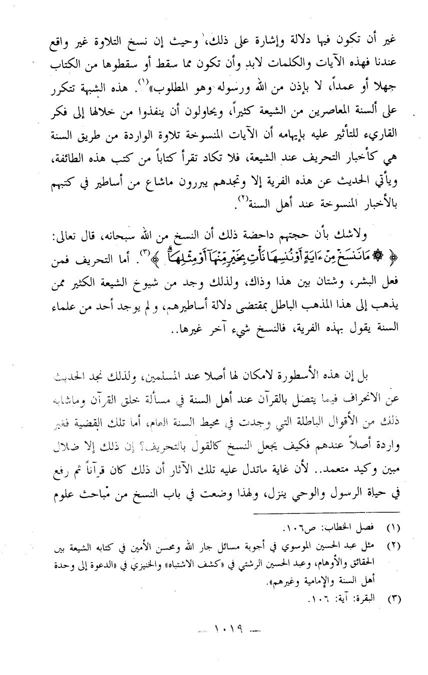 ولا شك أن حجتهم داحضة؛ ذلك أن النسخ من الله سبحانه، قال تعالى: {مَا نَنسَخْ مِنْ آيَةٍ أَوْ نُنسِهَا نَأْتِ بِخَيْرٍ مِّنْهَا أَوْ مِثْلِهَا} (¬3) . أما التحريف فمن فعل البشر، وشتان بين هذا وذاك، ولذلك وجد من شيوخ الشيعة الكثير ممن يذهب إلى هذا المذهب الباطل بمقتضى دلالة أساطيرهم، ولم يوجد أحد من علماء السنة يقول بهذه الفرية، فالنسخ شيء آخر غيرها.