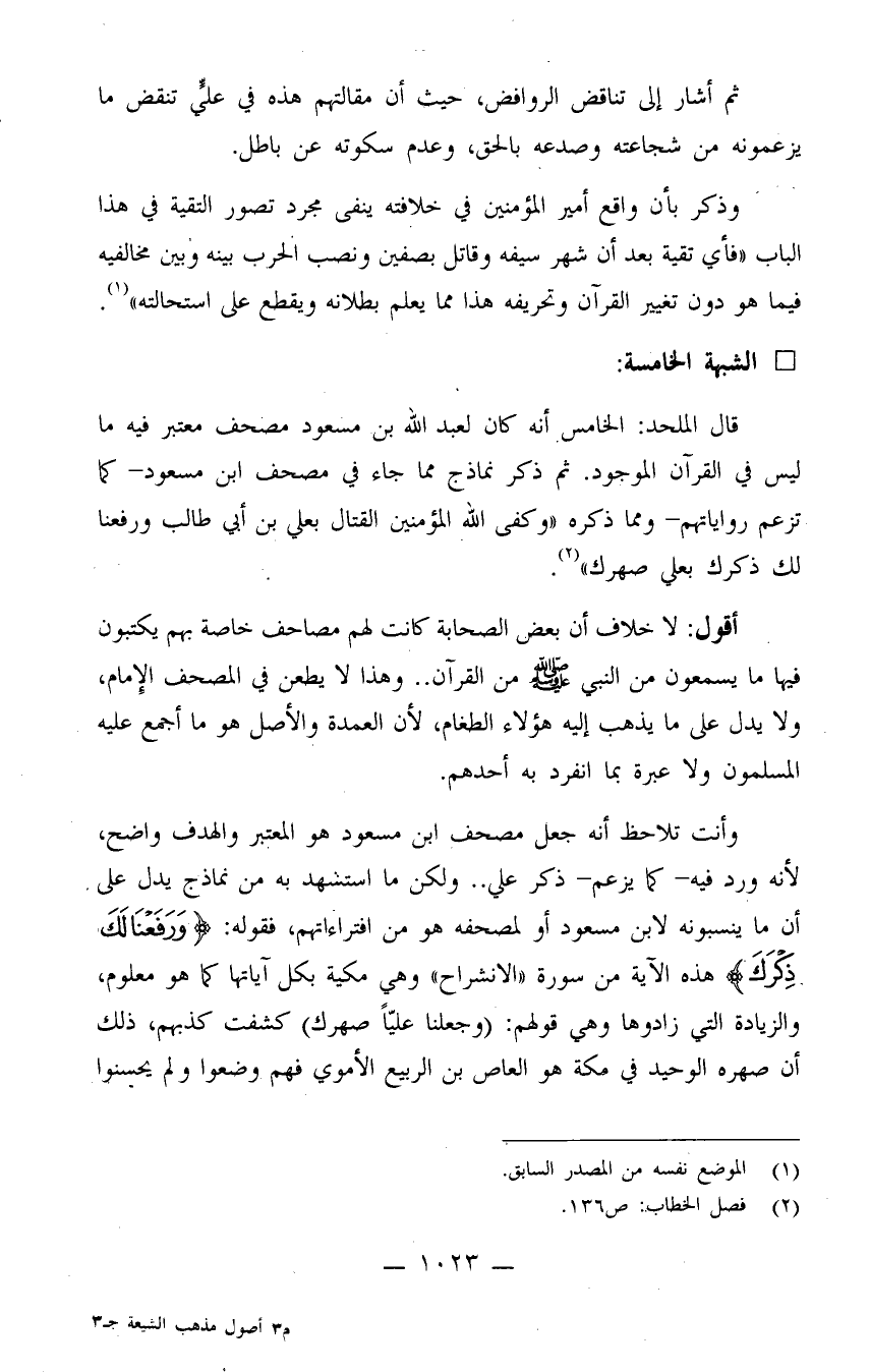 وأنت تلاحظ أنه جعل مصحف ابن مسعود هو المعتبر والهدف واضح؛ لأنه ورد فيه - كما يزعم - ذكر علي.. ولكن ما استشهد به من نماذج يدل على أن ما ينسبونه لابن مسعود أو لمصحفه هو من افتراءاتهم، فقوله: {وَرَفَعْنَا لَكَ ذِكْرَكَ} هذه الآية من سورة "الانشراح" وهي مكية بكل آياتها كما هو معلوم، والزيادة التي زادوها وهي قولهم: (وجعلنا علياً صهرك) كشفت كذبهم؛ ذلك أن صهره الوحيد في مكة هو العاص بن الربيع الأموي، فهم وضعوا ولم يحسنوا