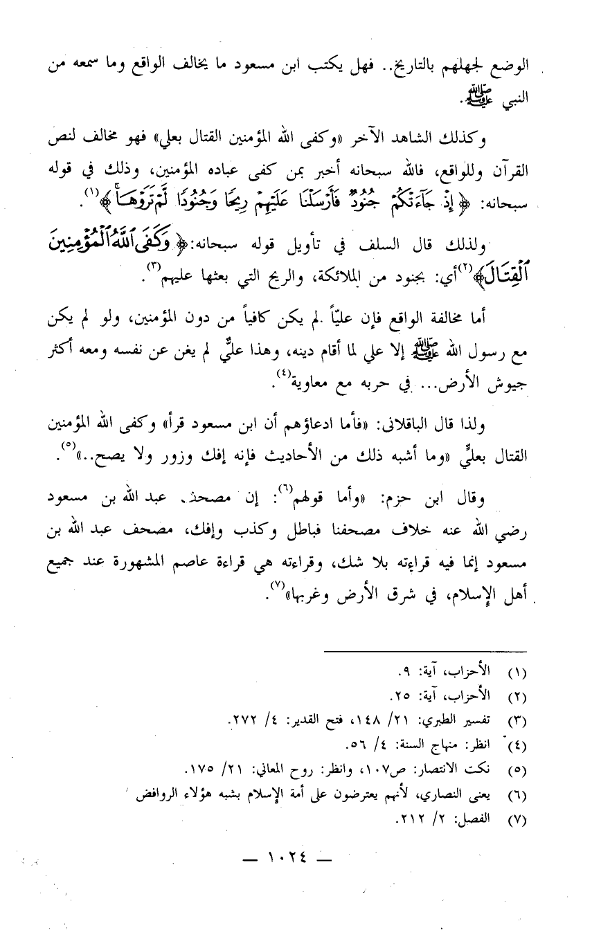 وكذلك الشاهد الآخر "وكفى الله المؤمنين القتال بعلي" فهو مخالف لنص القرآن وللواقع، فالله سبحانه أخبر بمن كفى عباده المؤمنين، وذلك في قوله سبحانه: {إِذْ جَاءَتْكُمْ جُنُودٌ فَأَرْسَلْنَا عَلَيْهِمْ رِيحًا وَجُنُودًا لَّمْ تَرَوْهَا} (¬1) .