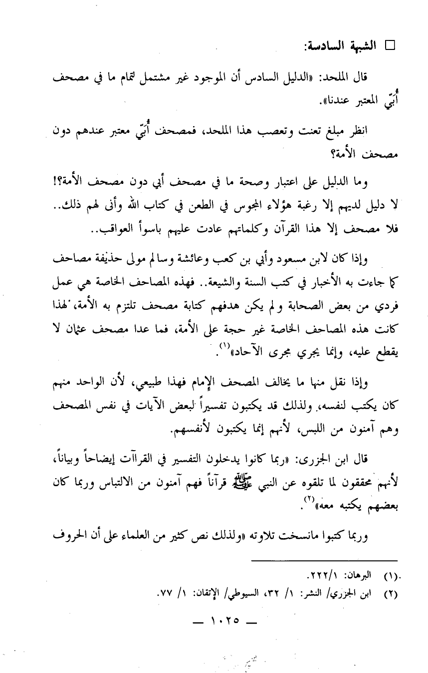 قال الملحد: "الدليل السادس أن الموجود غير مشتمل لتمام ما في مصحف أبيّ المعتبر عندنا".