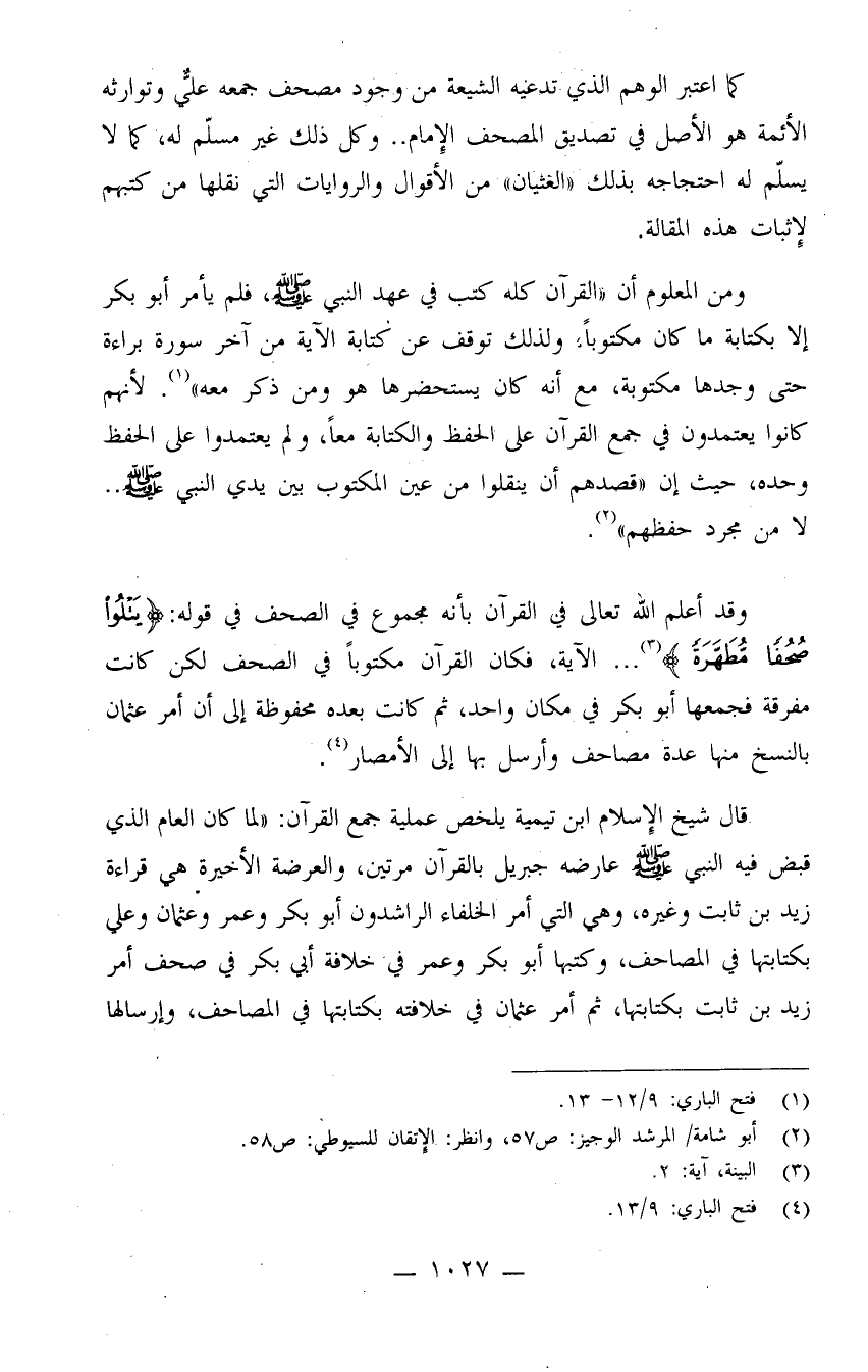 كما اعتبر الوهم الذي تدعيه الشيعة من وجود مصحف جمعه علي وتوارثه الأئمة هو الأصل في تصديق المصحف الإمام.. وكل ذلك غير مسلّم له، كما لا يسلّم له احتجاجه بذلك "الغثيان" من الأقوال والروايات التي نقلها من كتبهم لإثبات هذه المقالة.